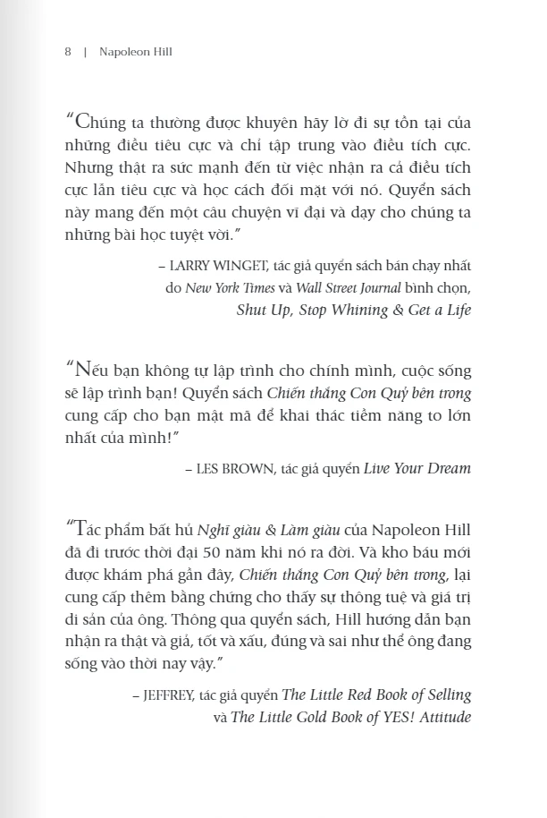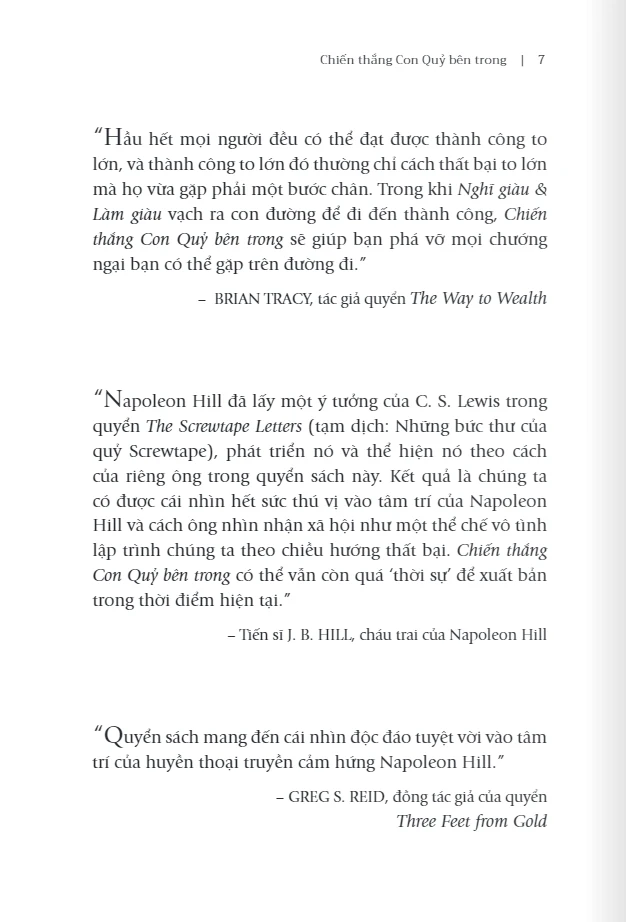 7. Sự cẩn trọng (xem xét kỹ càng kế hoạch trước khi hành động) Khi ra mắt công chúng hiện đại sau 72 năm bị cất giấu, “Chiến thắng Con Quỷ bên trong” được chú thích và biên tập bởi Sharon Lechter (đồng tác giả của cuốn “Rich Dad, Poor Dad” - Cha giàu, cha nghèo), người đã có nhiều năm đi sâu vào nghiên cứu và thực hành các nguyên tắc của Napoleon Hill. Những lời nhận định của Sharon Lechter được đưa vào xen kẽ xuyên suốt cuốn sách giúp người đọc nhìn thấy rõ hơn mối liên hệ chặt chẽ giữa triết lý của Napoleon Hill với bối cảnh ngày nay: khủng hoảng kinh tế, những điều bất ổn, những cám dỗ và nỗi lo sợ thường trực mà phần đông chúng ta vẫn ngày ngày đối mặt… Với văn phong thẳng thắn, trực diện, thâm thúy nhưng đầy thú vị và lôi cuốn, có thể nói “Chiến thắng Con Quỷ bên trong” là cuốn sách dành cho con người trong mọi thời đại. Bởi lẽ, những thông điệp mà Napoleon Hill đúc kết không chỉ đúng với thời đại của ông mà còn vẹn nguyên giá trị cho tới ngày nay, thậm chí là tương lai. Từng lời nói của Con Quỷ như “chỉ điểm” thẳng vào từng ngóc ngách còn lười nhác, dễ dãi, yếu hèn bên trong mỗi chúng ta. Để từ đó, cuốn sách sẽ khơi dậy nguồn cảm hứng và năng lượng cũng như “thổi bùng” ngọn lửa ý chí tự do vốn sẵn có bên trong mỗi người.
