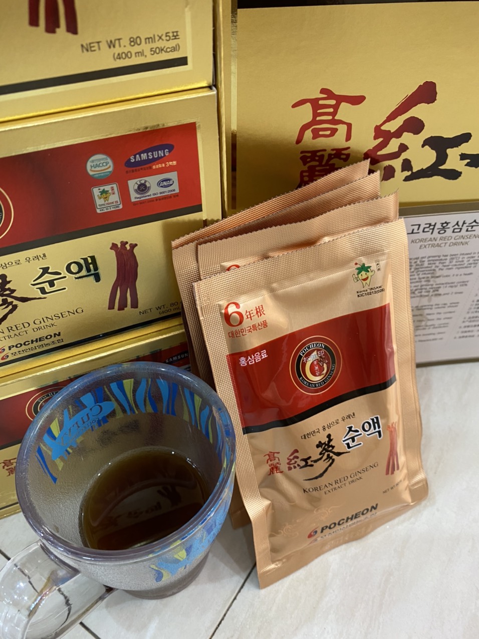 Xin trân trọng giới thiệu đến quý khách hàng dòng sản phẩm Nước Hồng Sâm thiên nhiên cao cấp được nhập khẩu chính hãng trực tiếp từ Hàn Quốc. Nước Hồng Sâm là sản phẩm được chiết xuất từ 100% tinh chất Hồng Sâm thiên nhiên Hàn Quốc.                                               Chỉ với 1 gói nhỏ 80ml cung cấp đầy đủ dưỡng chất cần thiết cho cơ thể của bạn và gia đình cho một ngày hoạt động, Thiết kế sản phẩm trang nhã, bắt mắt và sang trọng. Chiết xuất hồng sâm phù hợp để dùng làm quà tặng người thân, bạn bè và đồng nghiệp trong những dịp tết đến, xuân về. Thành phần dinh dưỡng của nước sâm Hàn Quốc  Được chiết xuất  từ 100% củ hồng sâm hàn quốc 6 năm tuổi với tỉ lệ phối trộn hồng sâm củ 70% và 30% rễ hồng sâm. Thành phần Rg1+Rg3> 5,5mg/gam trong sản phẩm Thời hạn sử dụng: 24 tháng kể từ ngày sản xuất. Ngày sản xuất in trên bao bì. Công dụng của nước sâm Hàn Quốc dạng gói 80ml: Giúp bồi bổ sức khỏe, tăng cường sức đề kháng, giúp cơ thể kháng lại các tác nhân độc hại từ môi trường xung quanh. Giảm mệt mỏi, căng thẳng do tác động của công việc và cuộc sống. Giúp chống lão hóa hiệu quả từ bên trong lẫn bên ngoài cơ thể. Ngăn ngừa và hỗ trợ điều trị đắc lực những bệnh lý nguy hiểm thường gặp, như tim mạch, tiểu đường, các bệnh lý về gan, đặc biệt hỗ trợ ngăn ngừa ung thư hiệu quả. Đối tượng sử dụng nước hồng sâm Hàn Quốc: Sản phẩm dùng được với mọi nhu cầu sức khỏe ở mọi lứa tuổi và giới tính người dùng. Thích hợp với người cao tuổi, người có thể trạng yếu, người đang trong quá trình dưỡng bệnh, người làm việc ở môi trường áp lực cao, người thường xuyên làm việc về đêm. Hướng dẫn sử dụng và bảo quản: Dùng trực tiếp 1-2 lần/ngày, người lớn 70ml/ lần, trẻ em uống bằng ½ liều người lớn. Vì sản phẩm được chiết xuất 100% từ Hồng Sâm thiên nhiên, không chứa chất bảo quản, nên nếu dùng không hết sản phẩm. Vui lòng bảo quản trong ngăn mát tủ lạnh. Bảo quản nơi khô ráo, thoáng mát, tránh ánh nắng trực tiếp Quy cách đóng gói: Một hộp gồm có 30 gói, mỗi gói 80ml Nguồn gốc xuất xứ: Pocheon Co., Ltd – Hàn Quốc Xuất xứ: Hàn Quốc lưu ý sản phẩm này không phải là thuốc không thay thế thuốc chữa bệnh