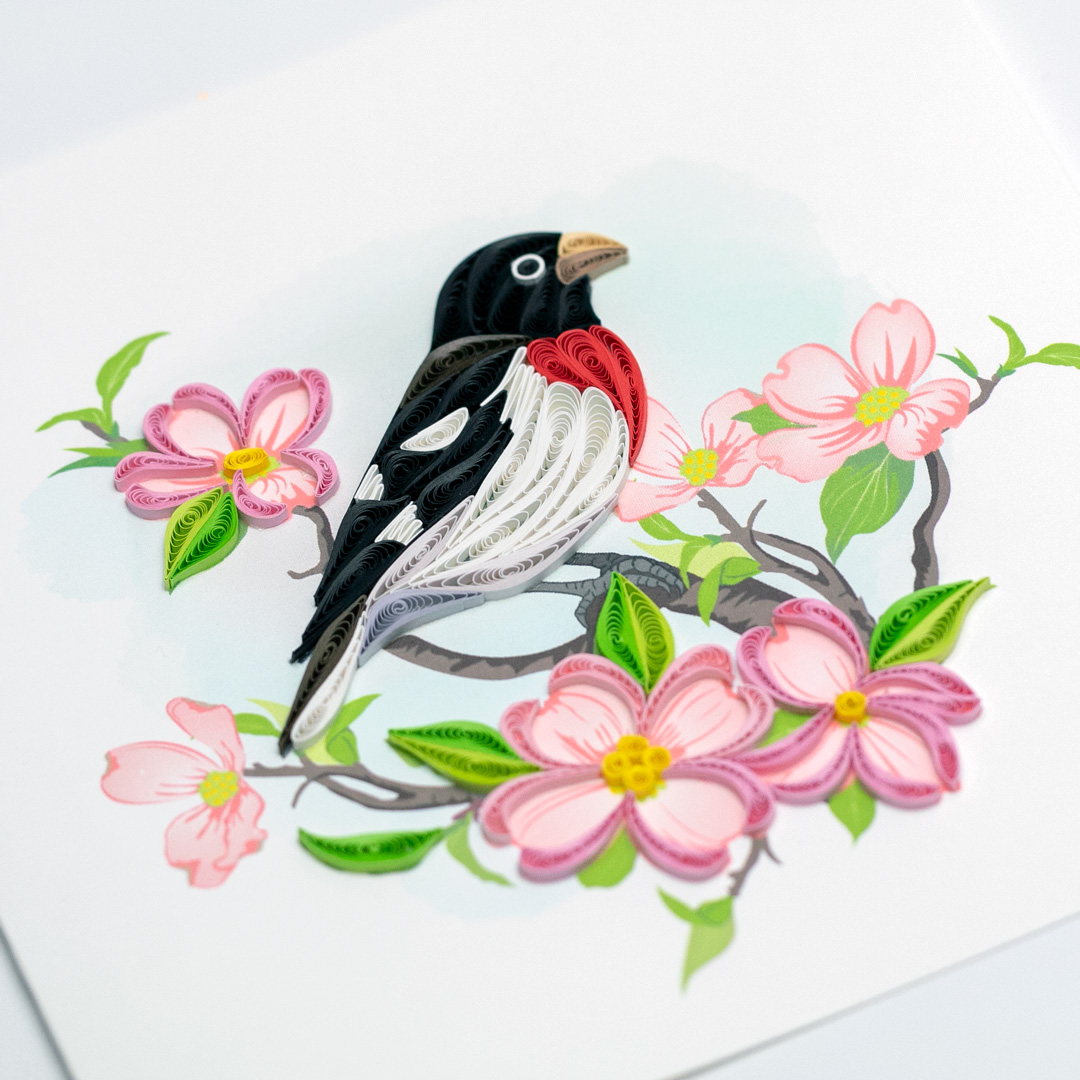 ✨Chim tước mỏ lớn ngực đỏ và hoa thù du hồng - Thiệp giấy xoắn 15 x 15 cm