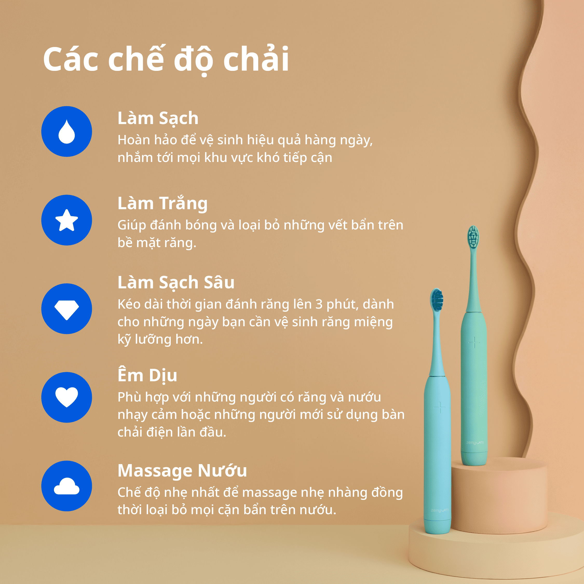 LƯU Ý: Quý khách vui lòng check kỹ toàn bộ sản phẩm nhận được và quay video toàn bộ quá trình bóc hàng. Shop chỉ giải quyết khi có video. Shop xin cảm ơn!   Bàn chải điện ZenyumSonic 2.0 là phiên bản nâng cấp của ZenyumSonic trước đây, ZenyumSonic 2.0 màu tự chọn với 7 màu thời thượng: Đen/Trắng/Hồng/Xanh Mint/Xanh dương và 2 sắc màu mới Tím và Xám   Trong mỗi hộp bàn chải đánh răng điện ZenyumSonic 2.0 bao gồm: 01 thân bàn chải điện 01 đầu bàn chải 01 sạc pin không dây (bao gồm đế sạc, dây cable cổng USB, không bao gồm adapter) 01 phiếu bảo hành 01 hướng dẫn sử dụng   Thông tin sản phẩm bàn chải đánh răng điện ZenyumSonic 2.0: Thương hiệu: Zenyum Công nghệ: Singapore Xuất xứ: Trung Quốc Chất liệu: nhựa TPE, sợi Dupont **Khuyến nghị sử dụng sản phẩm cho trẻ em từ 12 tuổi trở lên   Đặc điểm vượt trội của sản phẩm: Nút nhấn với 5 chế độ chuyên biệt ( trước đây chỉ có 3 chế độ): LÀM SẠCH, LÀM TRẮNG, LÀM SẠCH SÂU, ÊM DỊU, MASSAGE NƯỚU Sợi lông chải Dupont mềm mại loại bỏ mảng bám tốt hơn, đồng thời đem lại sự êm ái cho răng và nướu Công nghệ micro-pressure bubble tạo ra hàng triệu vi bong bóng giúp nhanh chóng làm sạch sâu từng kẽ răng Cơ chế hẹn giờ trong 2 phút, rung nhắc chuyển vùng mỗi 30s, cho hiệu quả làm sạch tối ưu theo khuyến cáo của nha sĩ Thời lượng pin lên tới 90 ngày (với 2 lần sử dụng/ngày) cho mỗi lần sạc đầy đủ Sạc nhanh qua cổng USB-C ở đuôi bàn chải, đèn thông minh báo hiệu hết pin và sạc đầy Thời gian sạc chỉ 4 giờ (trước đây 8 giờ) sạc nhanh, tiện lợi hơn Nâng cấp chuẩn chóng nước IPX8 ( trước đây là IPX7) ,an toàn khi sử dụng trong phòng tắm hoặc dưới nước và chống nước 100%   Thời lượng pin trung bình khi sử dụng 2 phút/lần, 2 lần/ngày. Kết quả có thể thay đổi tùy theo người dùng.   Hướng dẫn sử dụng: Cho một lượng kem đánh răng bằng hạt đậu lên đầu bàn chải. Nhấn nút + để khởi động bàn chải điện Tiếp tục nhấn nút + để thay đổi chế độ chải phù hợp Di chuyển đầu bàn chải nhẹ nhàng quanh các răng. Đổi bên sau mỗi 30 giây khi có tín hiệu rung.   Tùy Chỉnh với 5 chế độ chải răng: LÀM SẠCH: Chế độ hoàn hảo hàng ngày để vệ sinh hiệu quả, nhắm tới mọi khu vực khó tiếp cận. LÀM TRẮNG: Chế độ giúp đánh bóng và loại bỏ những vết bẩn trên bề mặt răng. LÀM SẠCH SÂU: Kéo dài thời gian đánh răng lên 3 phút, dành cho những ngày bạn cần vệ sinh răng miệng kỹ lưỡng hơn. ÊM DỊU: Phù hợp với những người có răng và nướu nhạy cảm hoặc những người mới sử dụng bàn chải điện lần đầu. MASSAGE NƯỚU: Chế độ nhẹ nhất để massage nhẹ nhàng đồng thời loại bỏ mọi cặn bẩn trên nướu. *Khuyến nghị thay đầu bàn chải sau 3 hoặc 6 tháng sử dụng để đảm bảo hiệu quả làm sạch   Cách Sạc Bàn Chải Điện ZenyumSonic2.0: Vặn nắp ở đáy bàn chải ngược chiều kim đồng hồ để mở cổng sạc USB-C. Đảm bảo cổng sạc khô hoàn toàn trước khi cắm sạc. Biểu tượng chế độ nhấp nháy khi đang sạc; sáng ổn định khi sạc hoàn tất. Thời gian sạc khoảng 4 giờ. Sau khi sạc xong, rút dây và vặn nắp lại theo chiều kim đồng hồ. Mẹo Sử Dụng: Rửa sạch đầu bàn chải sau mỗi lần dùng. Lau khô tay cầm bằng khăn mềm và để khô tự nhiên. Bảo quản nơi khô ráo, tránh ánh nắng trực tiếp. Thay đầu bàn chải sau mỗi 3 tháng sử dụng.   Chế độ bảo hành: Sản phẩm được bảo hành lỗi 1 đổi 1 trong 1 năm đối với các lỗi kỹ thuật điện, không bảo hành vấn đề bong tróc và các lỗi chủ quan trong quá trình sử dụng Cách thức liên hệ bảo hành: INBOX CHO SHOP   ZENYUM cam kết: ZENYUM cam kết mang đến cho khách hàng sản phẩm chính hãng với chất lượng tốt nhất trong tầm giá ZENYUM cam kết chính sách bảo hành tốt nhất cho khách hàng Cùng ZENYUM Sonic cải thiện thói quen chăm sóc răng miệng hiệu quả và sở hữu nụ cười trắng sáng rạng rỡ hơn mỗi ngày.   Lưu ý: Bàn chải chỉ tương thích với đầu bàn chải thay thế phiên bản tiêu ZenyumSonicvà đầu bàn chải thay thế phiên bảm êm dịu ZenyumSonic Không tương thích với đầu bàn chải thay thế ZenyumSonic Spark và ZenyumSonic Go   Hãy follow Zenyum để nhận ưu đãi/ voucher nhé!