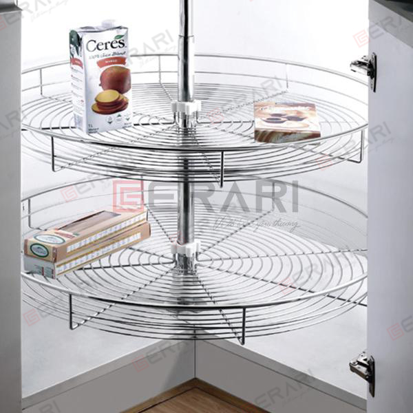 Đặc điểm nổi bật của Mâm xoay toàn phần Inox bóng cao cấp sợi tròn: - Thiết kế 1 trục cố định ở giữa và 2 mâm inox nan có thể xoay. - Được thiết