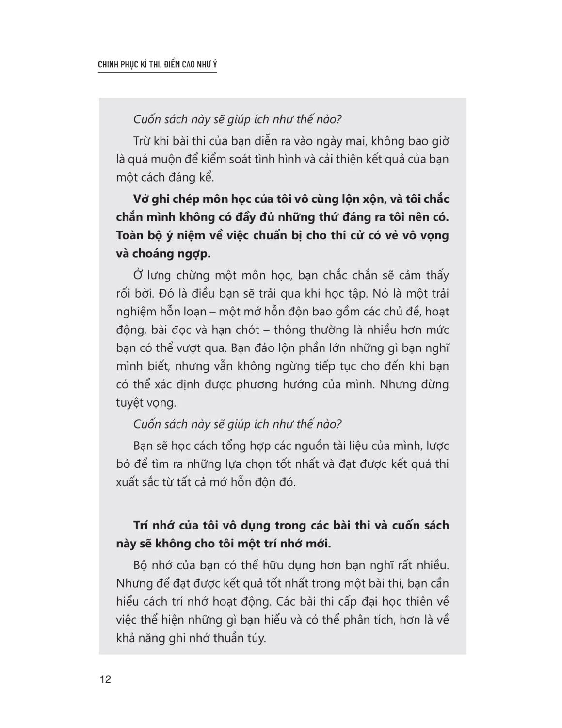 Hình thành hiểu biết sâu sắc về các bài thi và cách chuẩn bị cho chúng để bạn có thể tiếp cận chúng một cách tự tin và thành công ở hiện tại cũng như tương lai. Bên cạnh đó, cuốn sách sẽ giúp các bạn sinh viên xây dựng hiểu biết về các dạng bài thi thường gặp tại đại học, đồng thời hướng dẫn sinh viên lên chiến lược, lập kế hoạch ôn tập và tham dự kì thi sao cho đạt kết quả tốt nhất. Không chỉ vậy, sinh viên cũng sẽ học được cách vượt qua căng thẳng thi cử và ổn định về tâm lí để chinh phục kì thi. Đây chắc chắn là người bạn đồng hành không thể thiếu của sinh viên trong mọi bài thi tại giảng đường đại học.