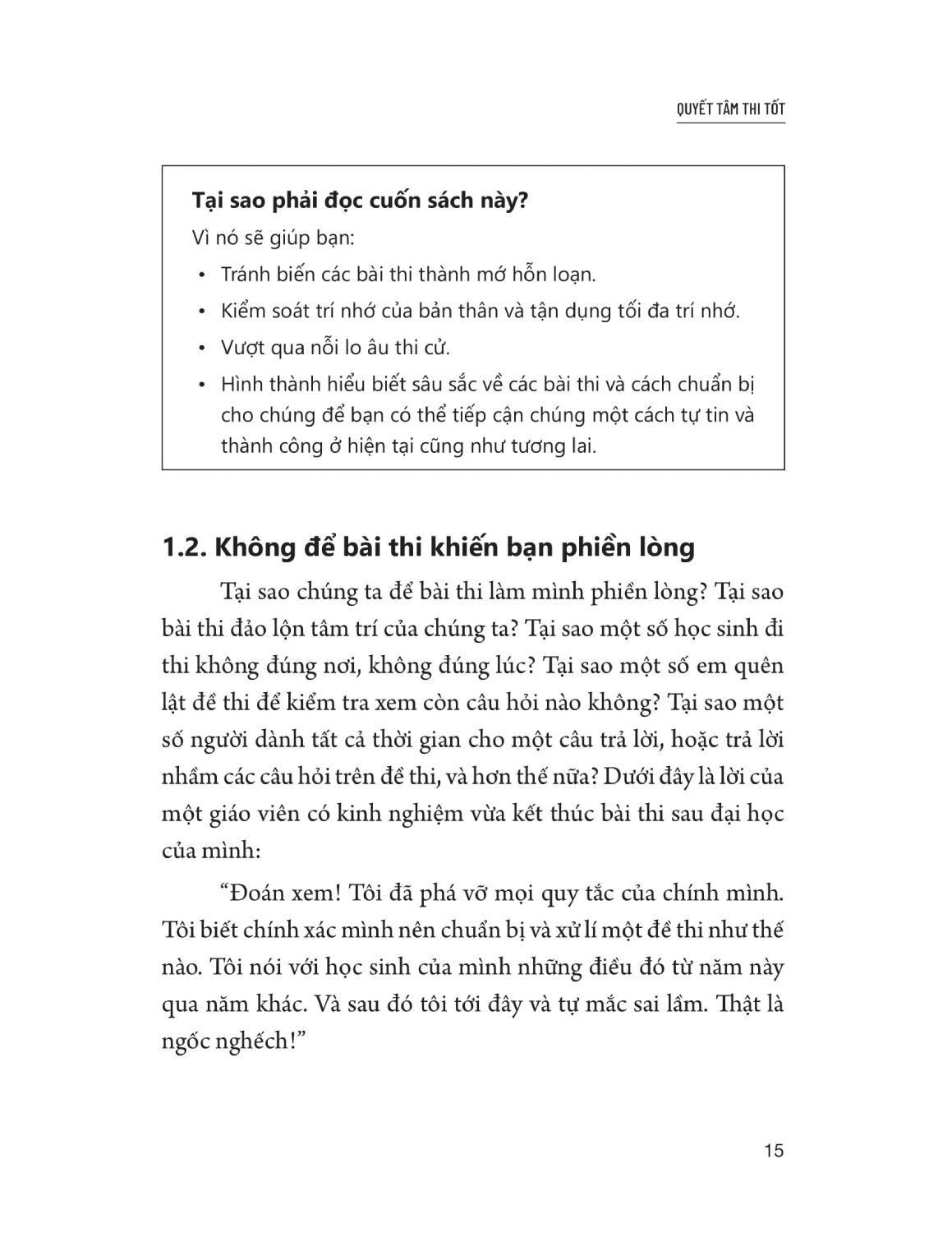 - Các bài thi thực ra không... đáng sợ đến thế! Các bài thi đóng một vai trò quan trọng trong cuộc sống của nhiều người - định hình trải nghiệm tuổi trẻ, cũng như khát vọng và triển vọng. Vậy mà, mặc cho tất cả sự hiện diện to lớn nhưng mờ ảo và ý nghĩa cá nhân của chúng, ta không thực sự hiểu rõ các bài thi hay biết cách hòa mình vào chúng một cách xây dựng và hữu dụng. Thực ra, các bài thi không bí ẩn hay đáng sợ như vẻ ngoài của chúng. Ta có thể thấu hiểu và hòa mình, thậm chí tận hưởng các bài thi, khi đã làm chủ và tận dụng được chúng.
