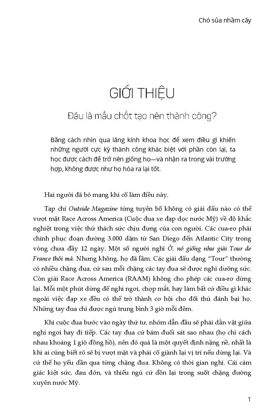 - Những người lính Navy SEAL và những nhân viên bán bảo hiểm có một điểm chung quan trọng, và cách sử dụng nguyên tắc WNGF trong thiết kế trò chơi để biến đống bài tập chán ngắt thành những trò chơi hấp dẫn. Rất nhiều lời khuyên về thành công rất logic, đầy cảm hứng, và sai bét. Bằng cách nhìn qua lăng kính khoa học để xem những người cực kỳ thành công khác với m.ình ở những điểm nào, ta học được cách để trở nên giống họ—và nhận ra trong vài trường hợp, không được như họ hóa ra lại tốt hơn. CHÓ SỦA NHẦM CÂY - BARKING UP THE WRONG TREE - là quyển sách gây tiếng vang, liên tục nằm trong danh sách bestseller Amazon của tác giả kiêm chủ trang blog Barking up the wrong tree - Eric Barker. Xuyên suốt nội dung sách, Eric sẽ cùng chúng ta lý giải một cách đầy hóm hỉnh nhưng không kém phần chặt chẽ những quan niệm khác nhau về thành công từ trước đến nay. Và ở cuối con đường đó, mỗi người chúng ta sẽ tự tìm thấy ngưỡng cửa thành công cho riêng m.ình.