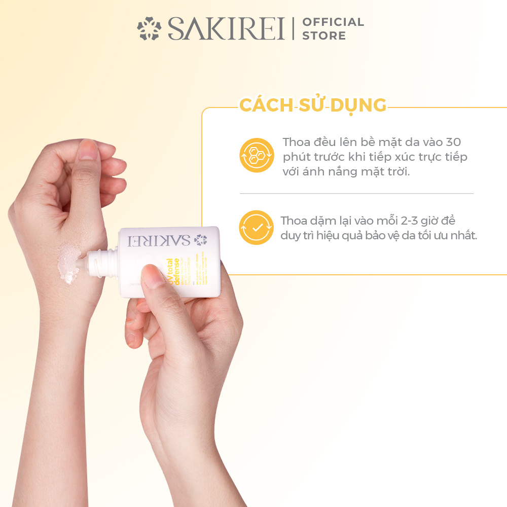 SERUM CHỐNG NẮNG VẬT LÝ SAKIREI Sakirei UV Total Defense Broad Spectrum SPF 50+ PA++++ Tinted Sunscreen Nhờ có chứa các thành phần Titanium Dioxide, Zinc Oxide, Tranexamic Acid, Niacinamide,... kết hợp NMN, sản phẩm Sakirei UV Total Defense Broad Spectrum SPF 50+ PA++++ Tinted Sunscreen không chỉ giúp da tránh tia UVA, UVB, HEV, IR, VIS mà còn cung cấp dưỡng chất làm sáng, giảm thâm sạm.