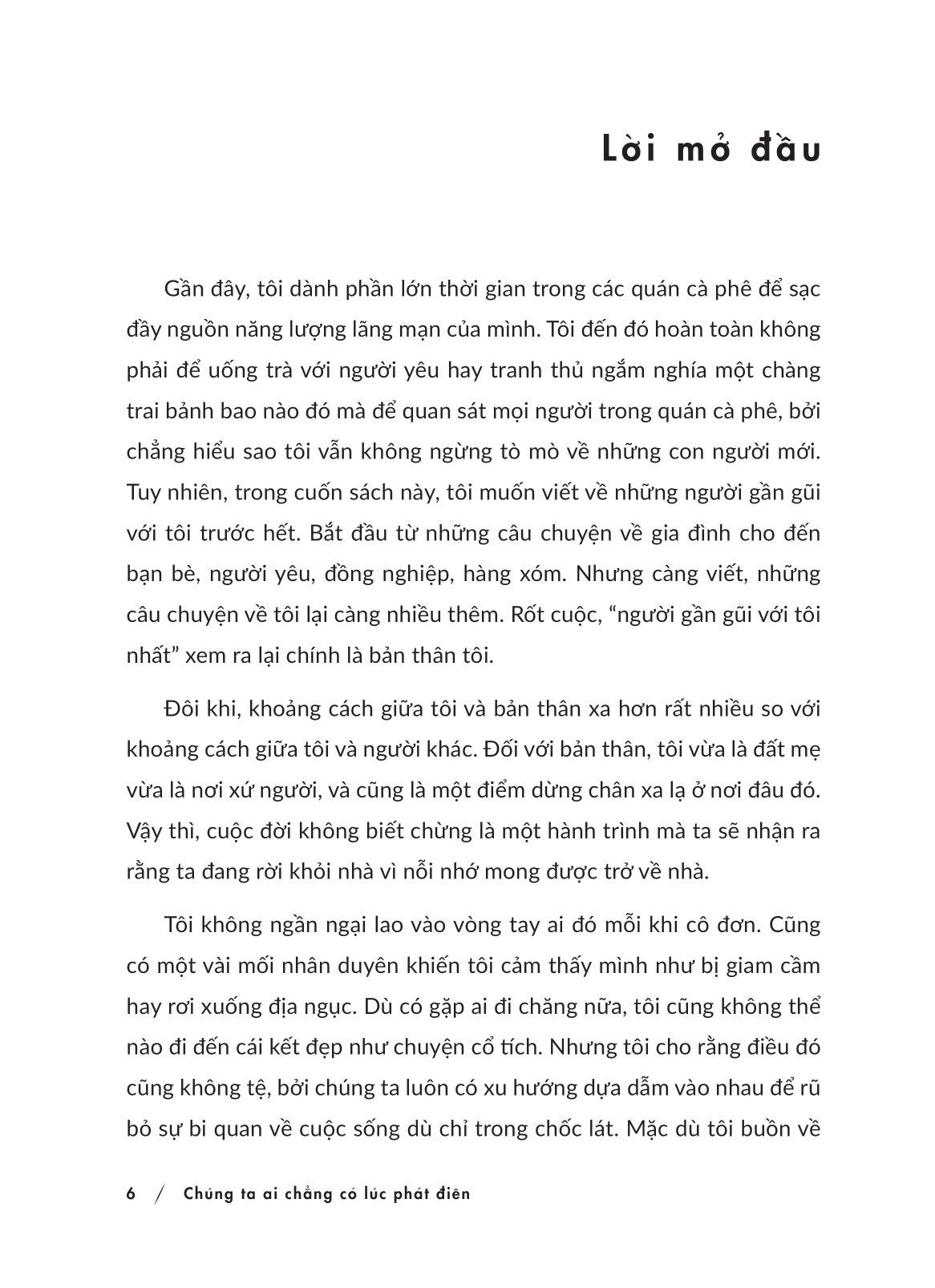 Chúng Ta Ai Chẳng Có Lúc Phát Điên “Chúng ta ai chẳng có lúc phát điên” là tập hợp những câu chuyện về khó khăn trong các mối quan hệ của cuộc sống mà ai cũng đã hoặc đang phải đối mặt hàng ngày nhưng có thể chưa biết cách vượt qua: người sếp độc hại, cha mẹ khắt khe, người yêu đòi hỏi, bạn bè không hiểu cho tâm tư của chúng ta, Và hàng loạt những căn bệnh tâm lý xuất hiện trong một xã hội dù tiện nghi được đẩy lên cao nhưng tình cảm giữa con người thì ngày càng xa cách: chứng rối loạn tăng động giảm chú ý, căn bệnh trầm cảm – bóng ma của thời đại, chứng sợ xã hội, Thông qua cuốn sách, tác giả muốn gửi đến thông điệp: “Nếu bạn hiểu chính m.ình, bạn có thể hiểu những người giống hoặc không giống bạn”. Qua lăng kính cùa một người mắc chứng ADHD đang cố gắng vượt qua những kỳ vọng của các mối quan hệ xung quanh, tác giả mong rằng bạn có thể tìm thấy sự đồng cảm sâu sắc và nhận ra, việc chấp nhận “người thân thiết nhất” – chính bản thân bạn – là chìa khóa để giúp các mối quan hệ xung quanh bạn cải thiện và tốt đẹp hơn. “Mọi người thường nghĩ rằng dù có chết đi sống lại, có lẽ họ cũng sẽ không thể hiểu hết lẫn nhau. Vì không thể hiểu nhau nên cũng không thể nào có được nhau. Họ chỉ đang lang thang với đôi bàn tay trống không mà thôi. Nhưng tôi tin rằng đôi bàn tay trống không của chúng ta sẽ được lấp đầy khi chúng ta trao cho nhau một cái bắt tay trong chốc lát, và sự lạnh lẽo của hai lòng bàn tay khi chạm vào nhau sẽ trở nên ấm áp. Dạo này, tôi thường suy nghĩ rằng tất cả chúng ta ai mà chẳng có những lúc phát điên, bởi vì niềm tin không xuất hiện chỉ bằng ý chí phải tin vào điều gì đó.” Về tác giả: Jeong Jeeumm là cây viết toàn thời gian, một người mắc chứng rối loạn tăng động giảm chú ý) ở tuổi 25. Cô học cách sống chung với căn bệnh, biến chứng nghiện điện thoại của m.ình thành thói quen ghi chép lại những quan sát cuộc sống xung quanh. Tính đến hiện tại cô đã xuất bản 17 bài báo, 2 cuốn sách, trong đó cuốn sách “Nỗi buồn của người ADHD” trở thành đầu sách bán chạy ở Hàn Quốc và được xuất bản dưới nhiều thứ tiếng khác nhau.