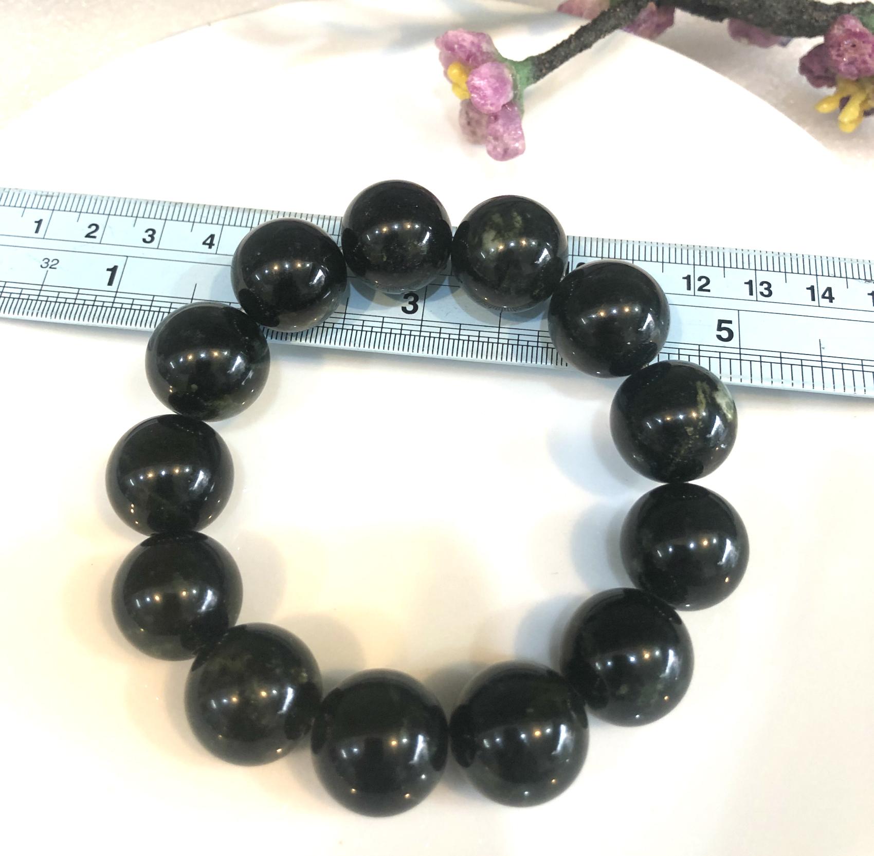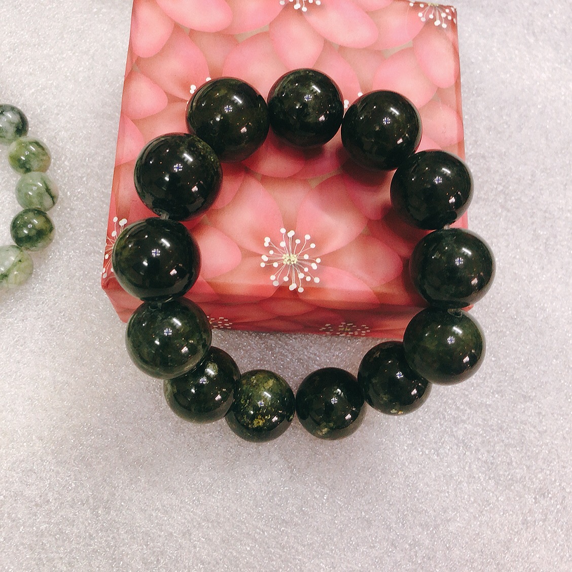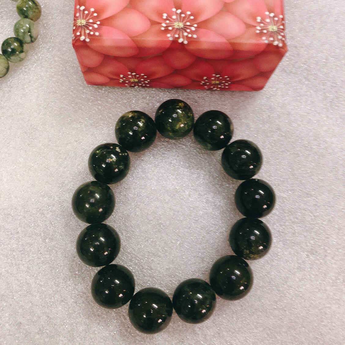Chất liệu: đá ngọc serpentine 100% của Việt Nam Kích thước: Li hột là 17 li (1.7 cm) màu xanh lá đen bóng tinh khiết Dùng để đeo tay hoặc để lần tràng hạt khi tụng kinh Tác dụng: Dòng đá (cẩm thạch) đá ngọc serpentine được chọn tỉ mỉ từ những tảng đá tự nhiên nguyên khối. Không phải tảng đá nào cũng có chất ngọc trong vắt bên trong (màu trong thấu đèn nằm trong đá gọi là ngọc) Chất này được cưa cắt từ tảng đá và chế tác thủ công thành trang sức. Nên nó có năng lượng dương rất tích cực, có thể ấn áp năng lượng xấu như stress và các từ trường phát ra từ máy tính, điện thoại và sóng wifi… Mang đá bên mình để “ nhân hữu thạch tất khang” ( Người có đá tất sẽ khỏe mạnh) Đeo đá tự nhiên bên mình để có lợi cho sức khỏe, chuỗi hạt gọc đá thật càng đeo lâu ngày quện mồ hôi của người đeo sẽ sáng bóng lên.