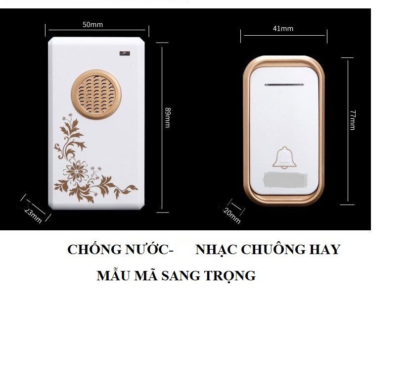 Mua tại Tiktok38 nhạc chuông để chọn và điều khiển âm lượng : 5 cấp (25- 100 dB) Đèn nền bắt mắt nhấp nháy khi ai đó nhấn chuông cửa. Đặc biệt thích hợp cho người già, người điếc và phụ nữ có thai. Sử dụng học máy để ngăn chặn nhiễu từ các máy phát không dây khác. Tự động lưu nhạc chuông đã chọn sau khi tắt nguồn Được thiết kế để tồn tại đến 25 năm. Tần số làm việc: 500 MHz Khoảng cách nhận: 350M (trong khu vực mở) Kích thước máy phát: 41 x 77 x 20 mm Kích thước máy thu:50 x 89 x 23 mm LƯU Ý: Nên thay pin sản phẩm trong trường hợp nút bấm không hoạt động