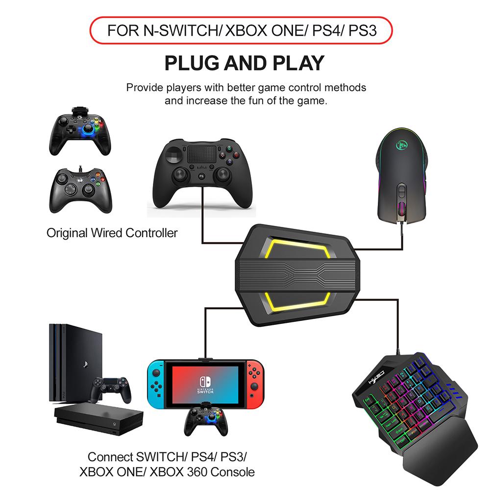Features: 【Mouse】 High-end optical engine, precise positioning. RGB light effect brings immersive and colorful visual effect. 4 adjustable DPI(1000/1600/3200/6400DPI) meet a variety of needs, maximum 6400DPI provides high precision, stable transmission and accurate analysis. Ergonomic design, comfortable hand feel, fit the palm, not easy to fatigue. USB interface, plug and play, no driver required, convenient to use. 【Keyboard】 35 keys compact layout, easy to operate with one hand. Ergonomic hand rest design reduces the pressure on the wrist, more comfortable to use. Built-in multiple LED dynamic light effects, with rainbow colors, to render gaming atmosphere. You can easily open/close light effect, turn on music player, adjust volume, mute, pause through the multimedia button. The keyboard supports Windows 2000, XP, ME, Vista, Win7, Win8, Android, Linux and other operating systems. 【Keyboard Mouse Converter】 Four-color breathing light effect, which can render gaming atmosphere. Small and portable, it's very convenient for daily use and travel. Plug and play, no driver required, convenient to use. Compatible with N-Switch/PS4/PS3/Xbox ONE/Xbox 360. Specification: 【A867 Mouse】 Type: Wired mouse Color: Black Msaterial: ABS DPI: 1000/1600/3200/6400DPI(adjustable) Key number: 7 Cable length: About 150cm Voltage rating/electric current: DC 5V/100mA System requirements: Windows 2000/XP/Win7/Win8/Win10/Vista 32bit/Mac OS or latest Item size: 12.8 7.1 4.5cm /5.04 2.8 1.77in Item weight: Approx. 132g /4.66oz 【V100 Keyboard】 Type: Single-hand gaming keyboard Color: Black Key number: 35 Interface: USB 2.0 Key life: 20 million times Cable length: 1.6m Flash ROM: 32 bytes EEPROM: Built-in 2K bytes Operating voltage: 3.3V-5.5V Working current: 100mA Item size:26 18 4cm / 10.24 7.09 1.57in Item weight: Approx.350g /12.35oz 【P6 Keyboard Mouse Converter】 Type: Keyboard mouse converter Color: Black Material: ABS Power interface: Type-C Rated voltage/current: DC 5V/100mA Compatible device: N-Switch/PS4/PS3/Xbox ONE/Xbox 360 Item size:11.4 9.5 2cm / 4.49 3.74 0.79in Item weight: Approx.100g/3.53oz Packing list: 1 A867 Mouse 1 V100 Keyboard 1 P6 Keyboard Mouse Converter 1 USB Cable 3 * User Manual
