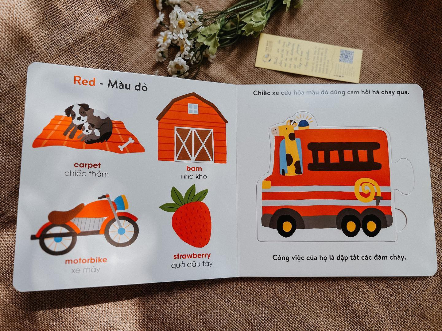 Trong cuốn sách Bộ sách đồ chơi – Giúp bé phát triển từ vựng và nhận biết màu sắc: Chuyến xe buýt sắc màu, bé sẽ được làm quen với 4 màu sắc cơ bản (đỏ, vàng, xanh dương và xanh lá), và trong mỗi trang màu cơ bản đó, bé sẽ được biết thêm 4 đồ vật/sự vật khác.