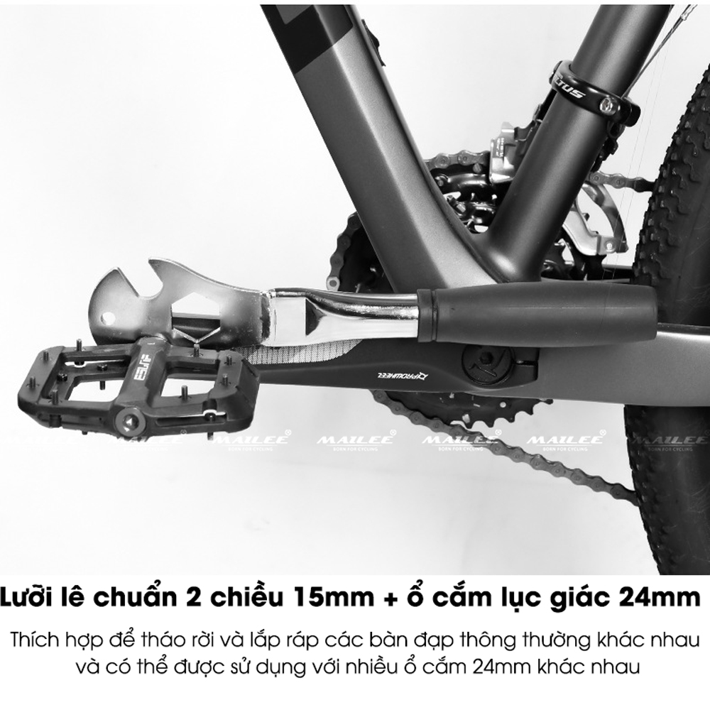 Cờ lê Tháo bàn đạp pedan xe đạp, tháo trục bánh xe trước sau, size 15mm 24mm 9/16" chất liệu thép không gỉ, tay cầm PVC chống trượt - Mai Lee Dụng cụ tháo dỡ bàn đạp xe đạp Dụng cụ tháo dỡ bàn đạp xe đạp được làm từ thép cứng cáp, trải qua quá trình tôi luyện và phủ 3 lớp mạ điện, chống gỉ sét hiệu quả. Bề mặt sản phẩm được xử lý phun cát, tạo độ bám chắc chắn.