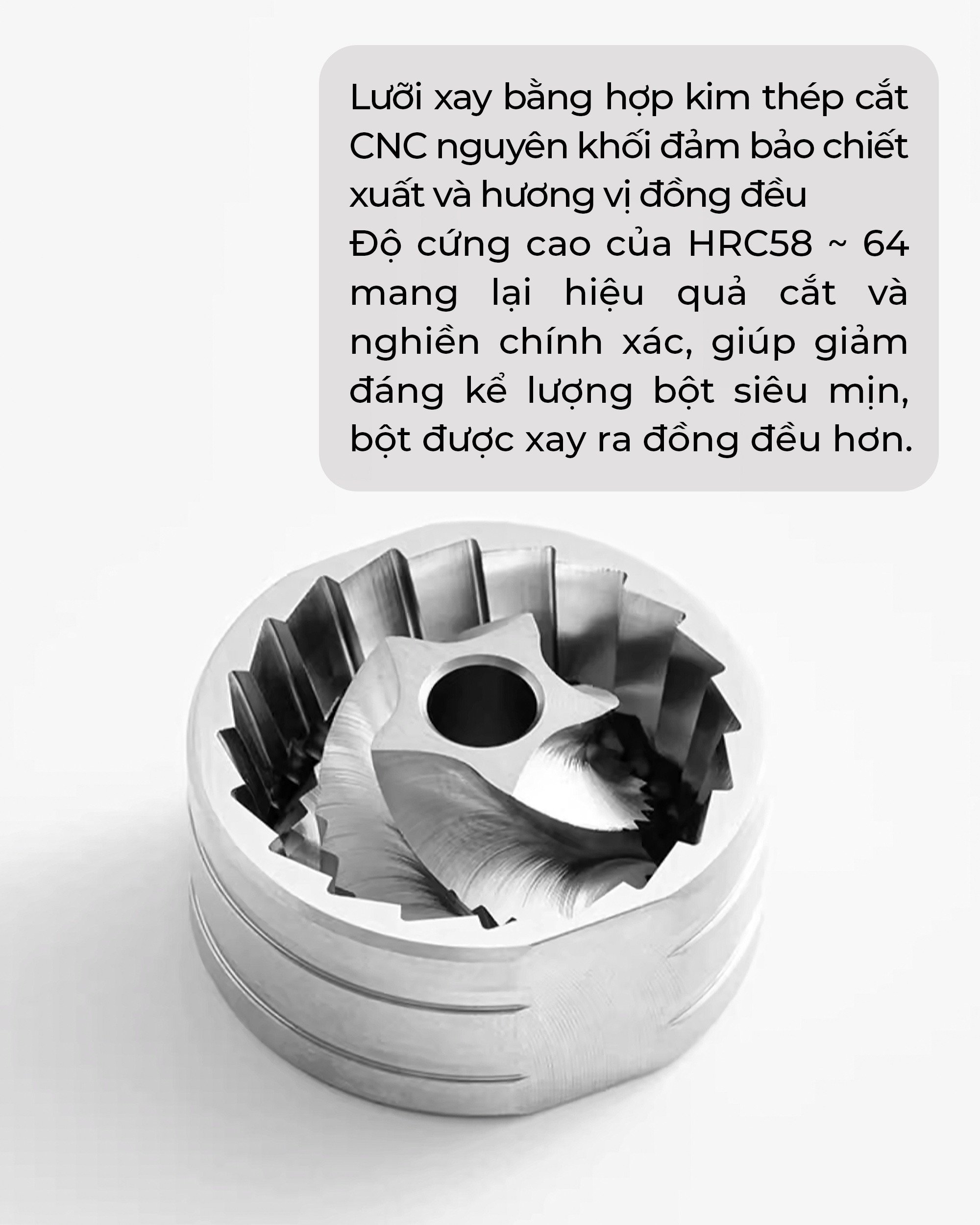 Trục xay bằng thép cứng ổn định với 2 vòng bi trên dưới: Cho bột cà phê có độ đồng đều đáng ngạc nhiên.