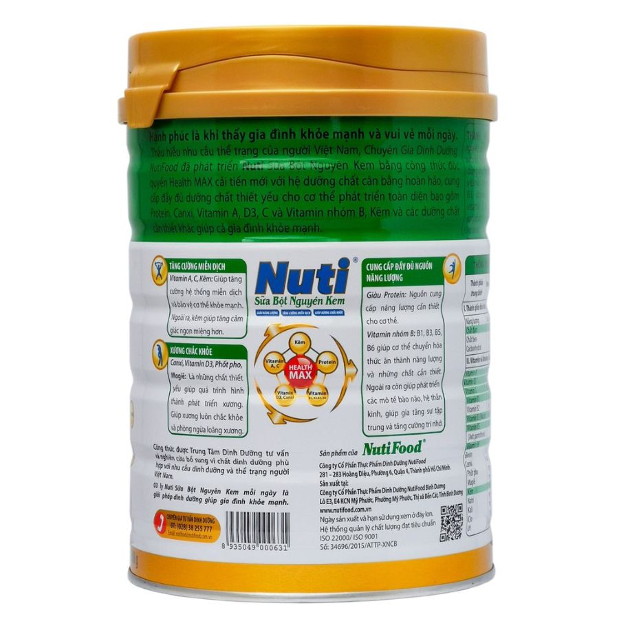 Sữa bột nguyên kem Nutifood với công thức độc quyền Health MAX cải tiến mới với hệ dưỡng chất cân bằng hoàn hảo cung cấp đầy đủ dưỡng chất thiết yếu cho cơ thể phát triển toàn diện bao gồm Protein, Canxi, Vitamin A, Vitamin D, Vitamin nhóm B, Kẽm. Sữa bột nguyên kem Nuti phù hợp với mọi người, người lớn, người cao tuổi, người già yếu suy kiệt, người suy dinh dưỡng, trẻ em từ 1 tuổi trở lên, thanh thiếu niên.