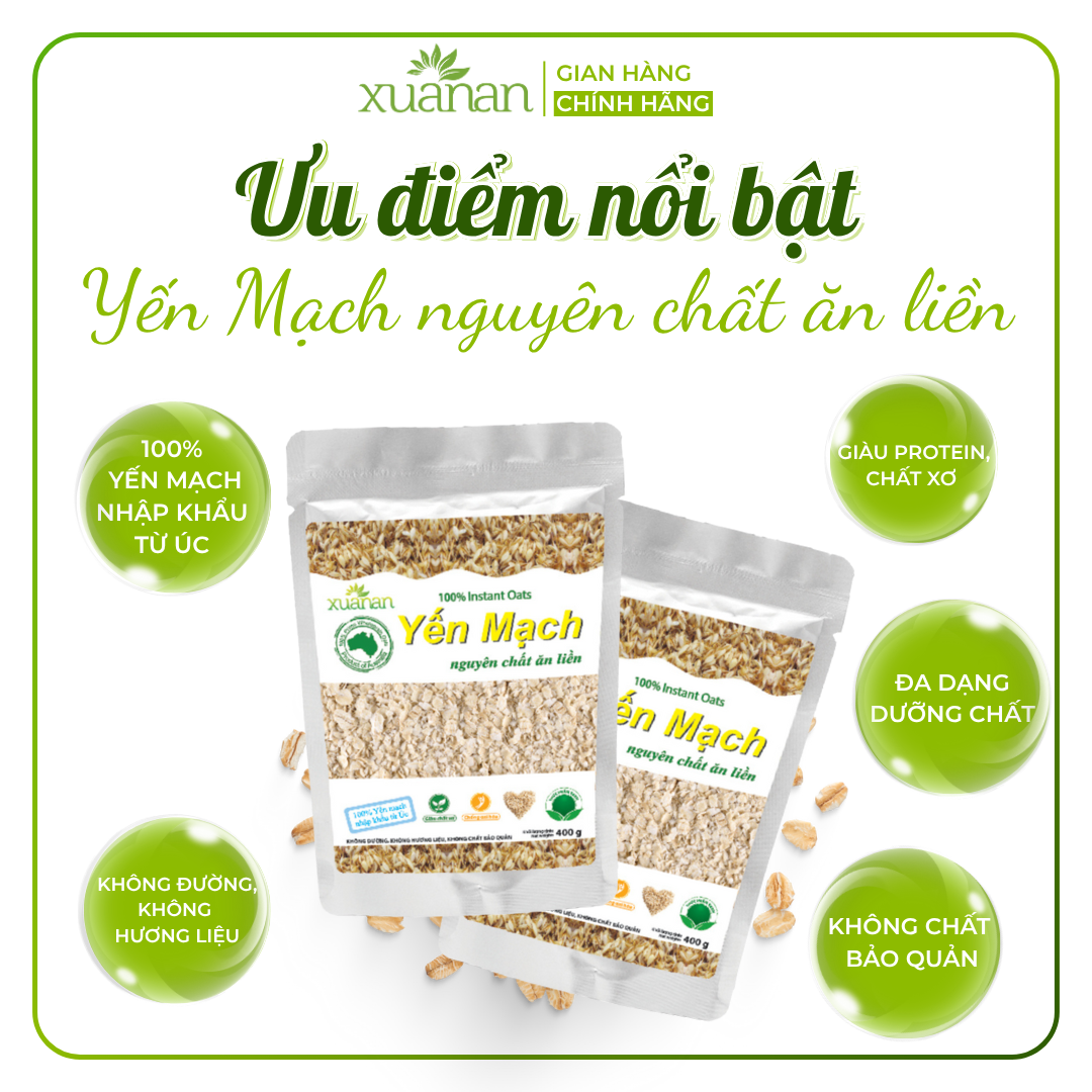 Yến mạch là loại ngũ cốc giàu chất xơ, giàu đạm, vitamin và dưỡng chất tự nhiên. Yến mạch nguyên chất Xuân An (Instant Oats) 100% được nhập khẩu từ ÚC.