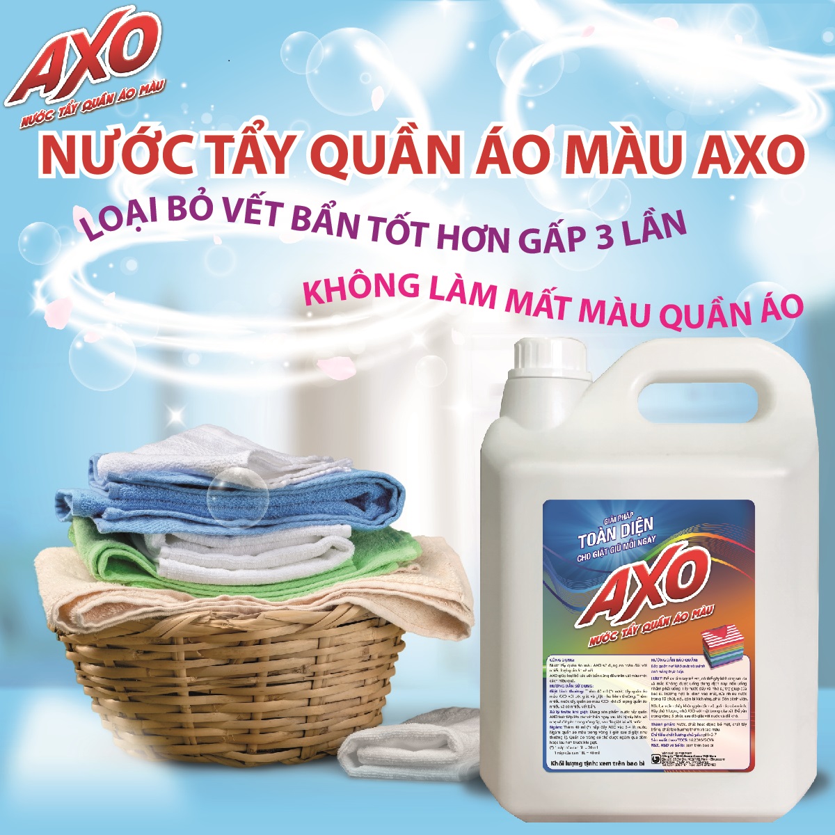 Nước Giặt Tẩy Quần Áo Màu AXO - Với công nghệ từ Philippines, AXO giúp tẩy sạch các vết bẩn trên quần áo màu như Cafe, Cari, dầu nhớt, vết mực, vết bút bi mà