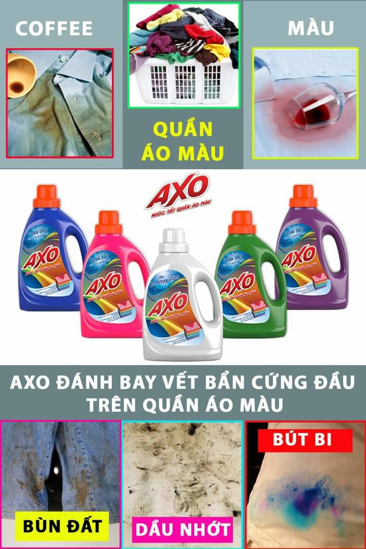 - Với công nghệ từ Philippines, AXO giúp tẩy sạch các vết bẩn trên quần áo màu như Cafe, Cari, dầu nhớt, vết mực, vết bút bi mà không làm bay màu quần áo.