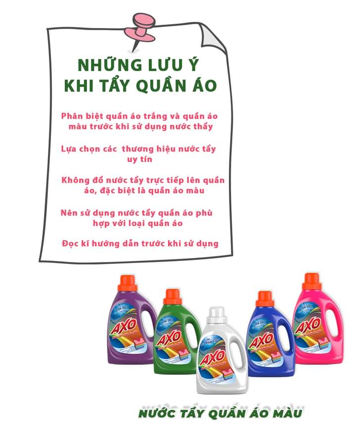 - Xử lý trước: Dùng sản phẩm nước tẩy bảo vệ màu AXO trực tiếp lên các vết bẩn ngay sau khi bị vấy bẩn. Vò nhẹ và để yên trong vòng 5 phút, sau đó giặt lại với nước.