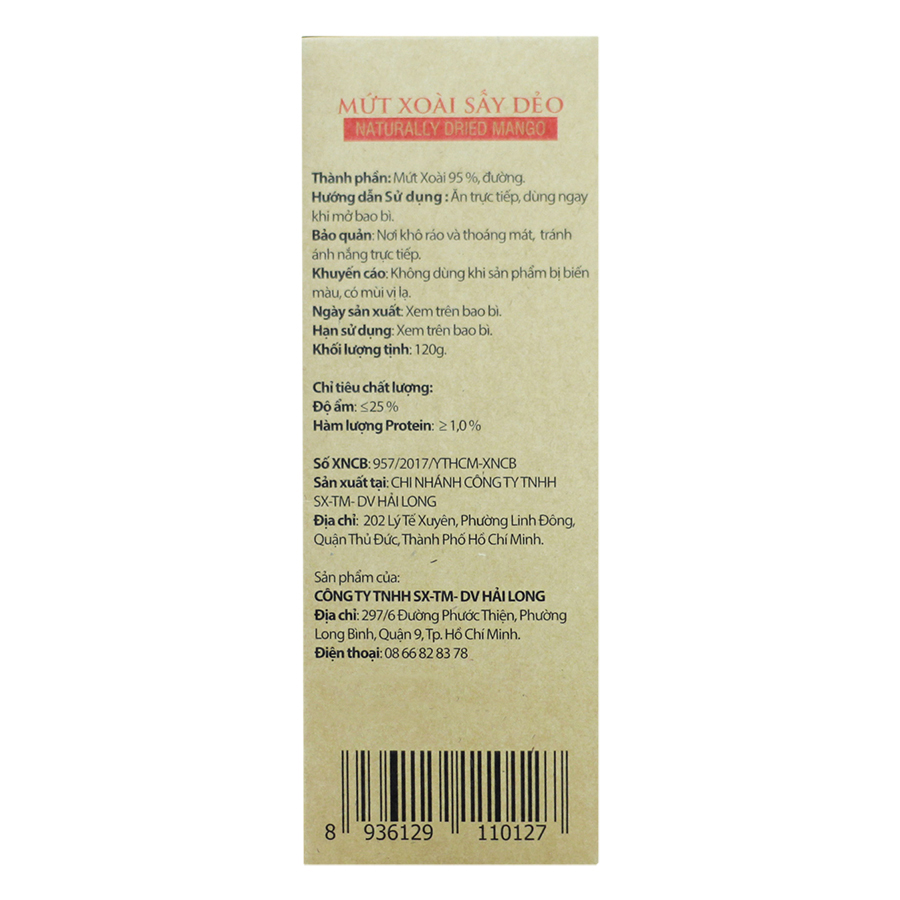 - Combo 2 Hộp Mứt Xoài Sấy Dẻo Hải Long (120g / Hộp) là món ăn vặt được nhiều người ưa chuộng bởi độ dẻo, vị chua chua ngọt ngọt thơm lừng, rất dễ ăn và phù hợp khẩu vị nhiều người.