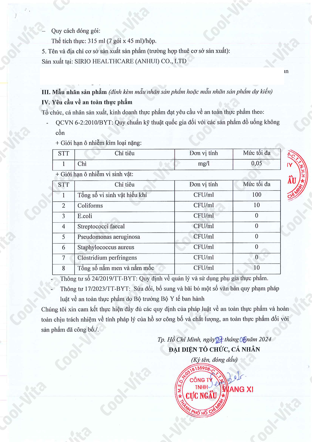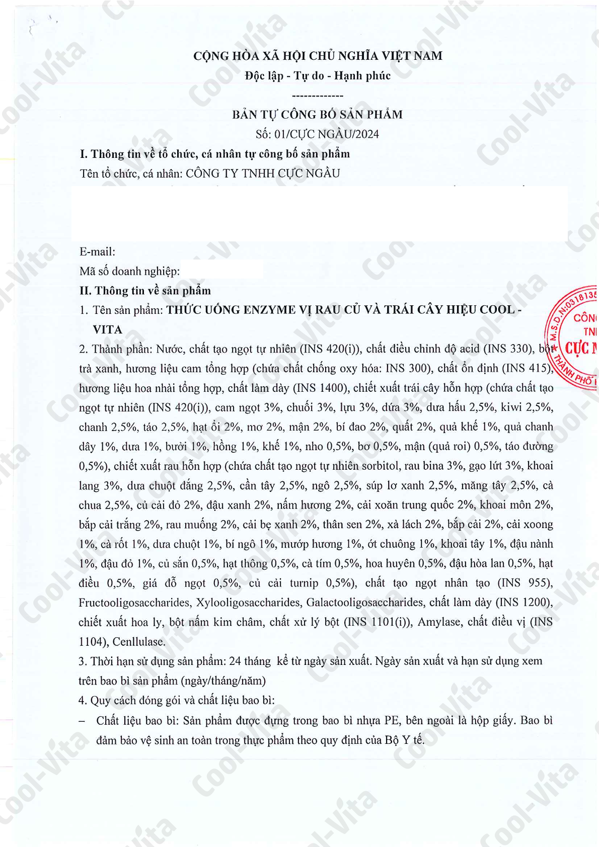 - Thành phần: Nước, chất tạo ngọt tự nhiên (INS 420(i)), chất điều chỉnh độ acid (INS 330), bột trà xanh, hương liệu cam tổng hợp (chứa chất chống oxy hóa: INS 300), chất ổn định (INS 415), hương liệu hoa nhài tổng hợp, chất làm dày (INS 1400), chiết xuất trái cây hỗn hợp (chứa chất tạo ngọt tự nhiên (INS 420(i)), cam ngọt 3%, chuối 3%, lựu 3%, dứa 3%, dưa hấu 2,5%, kiwi 2,5%, chanh 2,5%, táo 2,5%, hạt ổi 2%, mơ 2%, mận 2%, bí đao 2%, quất 2%, quả khế 1%, quả chanh dây 1%, dưa 1%, bưởi 1%, hồng 1%, khế 1%, nho 0,5%, bơ 0,5%, mận (quả roi) 0,5%, táo đường (0,5%), chiết xuất rau hỗn hợp (chứa chất tạo ngọt tự nhiên sorbitol, rau bina 3%, gạo lứt 3%, khoai lang 3%, dưa chuột đắng 2,5%, cần tây 2,5%, ngô 2,5%, súp lơ xanh 2,5%, măng tây 2,5%, cà chua 2,5%, củ cải đỏ 2%, đậu xanh 2%, nấm hương 2%, cải xoăn trung quốc 2%, khoai môn 2%, bắp cải trắng 2%, rau muống 2%, cải bẹ xanh 2%, thân sen 2%, xà lách 2%, bắp cải cải 2%, cải xoong 1%, cà rốt 1%, dưa chuột 1%, bí ngô 1%, mướp hương 1%, ớt chuông 1%, khoai tây 1%, đậu nành 1%, đậu đỏ 1%, củ sắn 0,5%, hạt thông 0,5%, cà tím 0,5%, hoa huyên 0,5%, đậu hòa lan 0,5%, hạt điều 0,5%, giá đỗ ngọt 0,5%, củ cải turnip 0,5%), chất tạo ngọt nhân tạo (INS 955), Fructooligosaccharides, Xylooligosaccharides, Galactooligosaccharides, chất làm dày (INS 1200), chiết xuất hoa ly, bột nấm kim châm, chất xử lý bột (INS 1101(i)), Amylase, chất điều vị (INS 1104), Cenllulase.