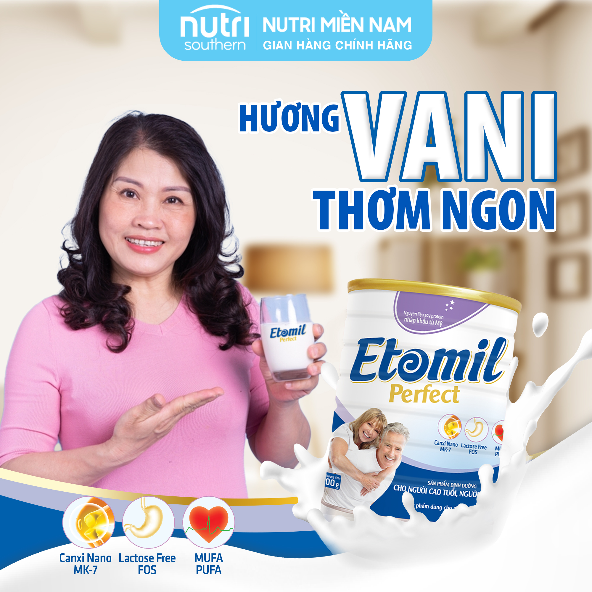 Sữa Cho Người Lớn Tuổi, Người Ốm Bệnh ETOMIL Perfect 900g - Dinh Dưỡng Vàng Cho Người Cao Tuổi, Hương Vị Dễ Uống     THÀNH PHẦN:     CÔNG DỤNG: -Etomil Perfect là sản phẩm dùng để thay thế bữa ăn phụ, giúp bổ sung năng lượng, chất đạm và các vi chất dinh dưỡng, -Etomil Perfect giúp bồi bổ và phục hồi sức khỏe.     ĐỐI TƯỢNG SỬ DỤNG: Người cao tuổi, người ốm bệnh, người cần phục hồi sau phẫu thuật, người gầy yếu, ăn uống kém. Sản phẩm không chứa đường lactose nên có thể dùng cho người bất dung nạp Lactose, người tiêu hóa kém. Người đang hoặc có nguy cơ loãng xương, xốp xương, người đang hoặc có nguy cơ xơ vữa động mạch.     HƯỚNG DẪN SỬ DỤNG: -Pha 5 muỗng gạt (tương đương 48g) với 190ml nước ấm chín được 1 ly khoảng 215ml. -Ngày uống 2-3 ly hoặc theo hướng dẫn của cán bộ y tế.     BẢO QUẢN: Bảo quản nơi khô ráo, sạch sẽ, thoáng mát, tránh ánh nắng trực tiếp. Lon sữa đã mở phải được đóng kín và sử dụng hết trong vòng 3 tuần   XUẤT XỨ: VIỆTNAM HẠN SỬ DỤNG: 36 THÁNG KỂ TỪ NGÀY SẢN XUẤT