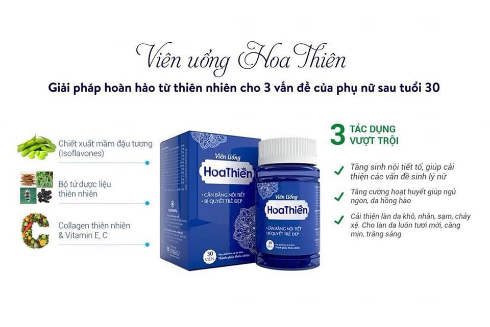 Viên uống Hoa Thiên Dựa trên sự phối hợp từ tinh hoa Y học cổ truyền, với các vị dược liệu quý như tinh chất mầm đậu tương, collagen, quy râu, ngưu tất, thục địa,