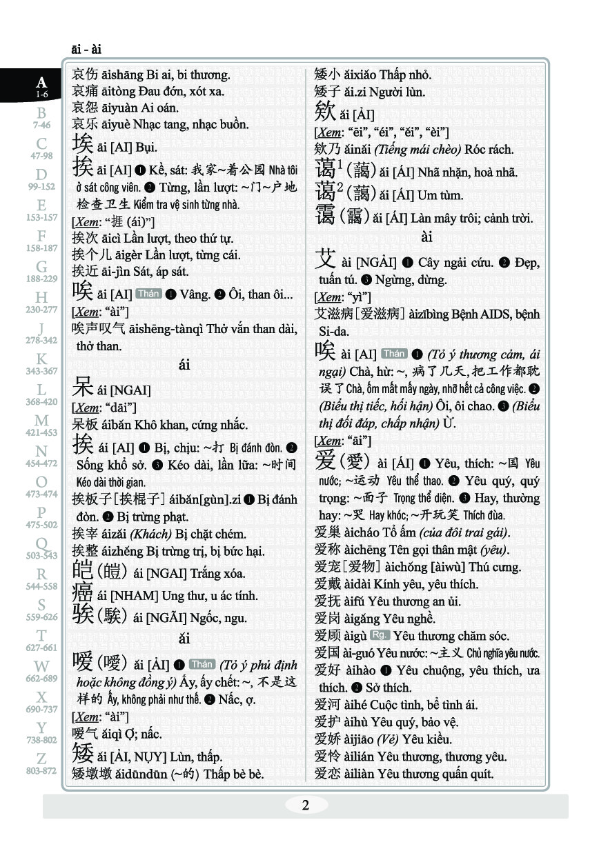 Phần Việt Hán có lượng từ vựng khá phong phú, cập nhật nhiều từ ngữ đang lưu hành hiện nay cũng như nhiều thuật ngữ chuyên ngành tin học, kinh tế, chính trị, xã hội, sinh học, y học, toán học, hóa học, vật lý học, văn học, ngôn ngữ học… Hầu hết những từ khó dùng đều được kèm theo ví dụ minh họa để các bạn có thể sử dụng linh hoạt trong những ngữ cảnh khác nhau.