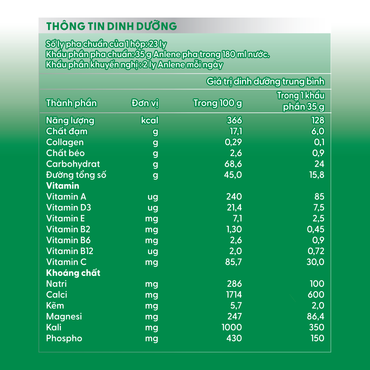 SỮA ANLENE HƯƠNG VANI Sản phẩm sữa dành cho người từ 30 tuổi trở lên Hệ Dưỡng Chất BoneMax Chứa hàm lượng cao: Đạm, Canxi, Collagen Vitamin: B, C, D Khoáng chất: Magiê, Kẽm Cung