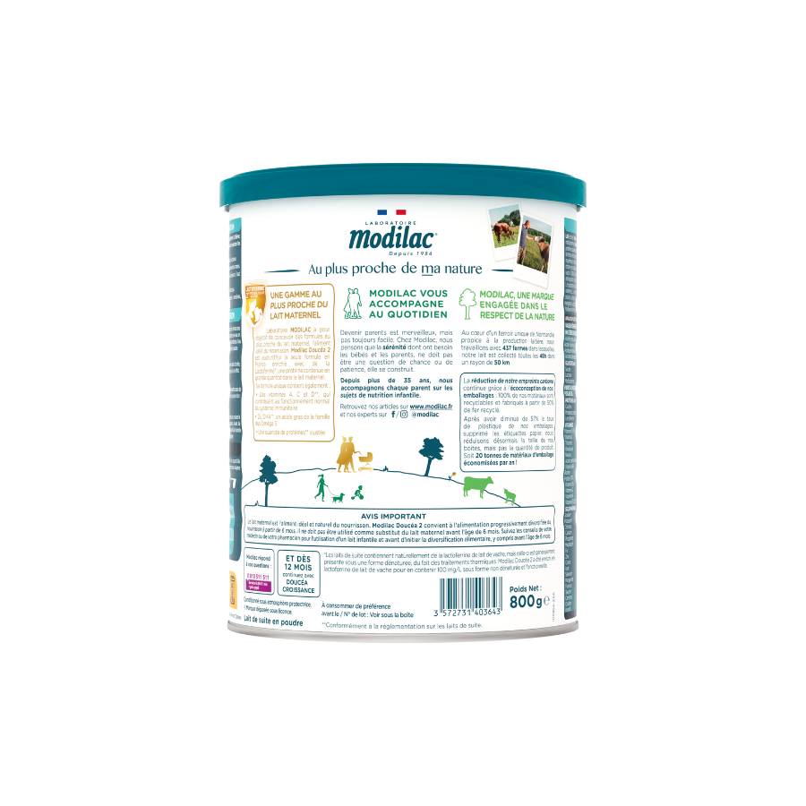 Sữa mẹ là thức ăn tốt nhất cho sức khỏe và sự phát triển toàn diện của trẻ sơ sinh và trẻ nhỏ.   Sữa bột cao cấp Modilac Doucéa số 2 dành cho trẻ từ 6 - 12 tháng tuổi được nhập khẩu nguyên hộp từ Pháp   MODILAC SỮA NỘI ĐỊA PHÁP - 9 ĐIỂM VÀNG CHẤT LƯỢNG CHO BÉ!   • Modilac cực kì dễ uống với vị sữa thanh nhạt, mùi thơm nhẹ, bé dễ dàng thích nghi khi chuyển từ sữa mẹ qua sữa công thức, hay đổi từ sữa công thức này qua sữa công thức khác • Sữa giúp bé tăng cân, tăng đề kháng, tăng ghi nhớ nhờ các dưỡng chất đắt đỏ: Lactoferrin, Bifidobacterium, Protein, DHA/ARA... • Sữa giúp bé giảm biếng ăn, giảm ốm vặt, giảm trằn trọc khó ngủ nhờ hệ dưỡng chất toàn diện, cung cấp năng lượng theo nhu cầu của cơ thể phù hợp với lứa tuổi   6 YÊN TÂM KHI MẸ CHỌN MODILAC SỮA NỘI ĐỊA PHÁP  • Modilac là dòng sữa nội địa cao cấp tại Pháp. • Là một trong ít nhãn sữa có viện nghiên cứu riêng. • Mỗi lon sữa Modilac Doucéa đều trải qua hơn 40 năm cải tiến không ngừng, phù hợp với sự phát triển của bé. • Trải qua hơn 800 lần xét nghiệm, hơn 200 lượt kiểm tra trước khi đưa ra thị trường. • Là dòng sữa công thức sản xuất bởi tập đoàn Savencia với hơn 60 xây dựng và phát triển. • Tại Việt Nam, Modilac Doucéa được phân phối bởi tập đoàn DETECH với lịch sử phát triển hơn 30 năm cùng đội ngũ nhân sự hàng nghìn người!   HƯỚNG DẪN SỬ DỤNG Lưu ý: Xuất xứ: Pháp Hạn sử dụng: 24 tháng Bảo quản sữa bột Modilac ở nơi thoáng mát, khô ráo trước và sau khi mở. Sau khi mở, đóng nắp thật chặt. Sử dụng trong vòng 1 tháng kể từ lần mở hộp đầu tiên.