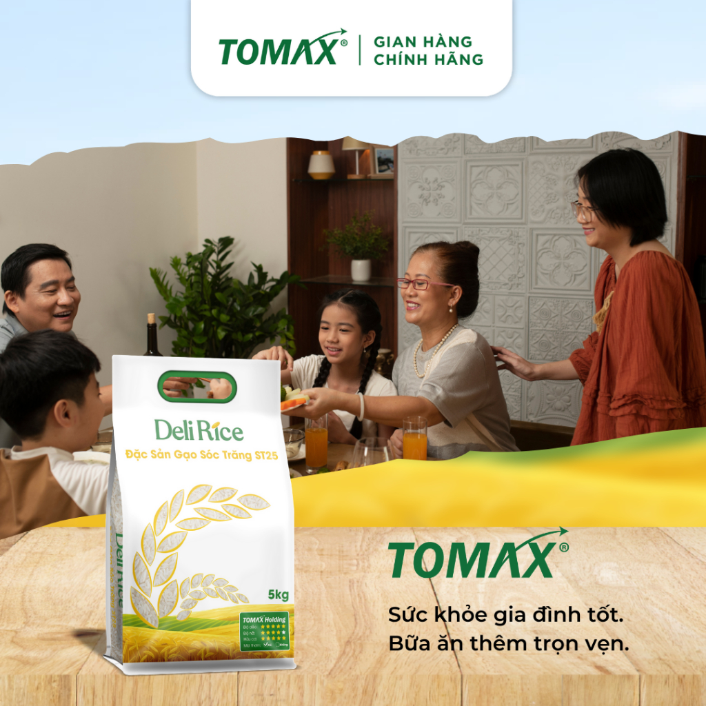 COMBO 2 TÚI 5KG GẠO HỮU CƠ ST25 Tomax THƯỢNG HẠNG, DẺO THƠM - TOMAX Với tâm huyết của một “lão nông tri điền”, ông Trần Văn Mây - Người sáng lập Gavi, đối tác sản xuất của TOMAX Holding đã nghiên cứu và ứng dụng phân bón hữu cơ vi sinh, kiến tạo mô hình nông nghiệp xanh tiêu biểu. Đồng thời tạo ra những sản phẩm an toàn, chất lượng cho người tiêu dùng, đưa giá trị gạo Việt vươn tầm thế giới. Được sản xuất từ 100% chế phẩm sinh học và các loại cây thảo dược có tính chất giải độc, phân bón hữu cơ vi sinh của TOMAX Holding đã nhanh chóng cải thiện chất lượng đất, nâng cao năng suất và chất lượng của cây lúa ngay vụ mùa đầu tiên. Đồng thời, TOMAX còn sử dụng giống lúa thuần chủng, quản lý côn trùng và bệnh hại theo phương pháp sinh học, ứng dụng công nghệ thu hoạch, chế biến và đóng gói theo tiêu chuẩn quốc tế để tạo ra những cánh đồng vàng bất tận với chất lượng cao cấp nhất. Việc canh tác theo quy trình khép kín đã giúp TOMAX Holding thành công mang đến khách hàng những sản phẩm gạo sạch thượng hạng, trong đó có gạo đặc sản Sóc Trăng ST25 Tomax 100% hữu cơ - Loại gạo giành giải nhất trong cuộc thi "Gạo ngon nhất thế giới" năm 2019 – World’s Best Rice. Giá trị ưu việt của Gạo sạch đặc sản Sóc Trăng ST25 Tomax Được canh tác theo hướng hữu cơ với quy trình khép kín đạt chuẩn, gạo sạch ST25 của Tomax Holding sở hữu những ưu điểm vượt trội: Được chọn lựa kỹ lưỡng, từng hạt gạo ST25 trắng ngần, dài, và có hương thơm tự nhiên đặc trưng, mang đến bữa cơm mềm dẻo, ngọt dịu, giữ trọn vẹn giá trị dinh dưỡng và hương vị tinh tế. Hoàn toàn tự nhiên - Không thuốc bảo vệ thực vật; Không hương liệu nhân tạo; Không chứa chất tạo màu, chất bảo quản; Không chất tẩy trắng, Không GMO đảm bảo an toàn và nâng cao sức khỏe cho người tiêu dùng. Canh tác hữu cơ với tiêu chuẩn an toàn vệ sinh thực phẩm quốc tế HACCP, FDA Chuỗi sản xuất khép kín và đồng nhất (Field - Factory - Food): Dễ dàng truy xuất nguồn gốc và kiểm soát chất lượng gạo. Luôn đảm bảo sản phẩm mới, sạch và trọn vẹn dưỡng chất từ hạt gạo. Khả năng chủ động và tự cung ứng trong quá trình gieo trồng, sản xuất nên giá thành sản phẩm cạnh tranh hơn, giao hàng nhanh và chính sách hậu mãi tốt. Thông tin chi tiết sản phẩm gạo đặc sản Sóc Trăng ST25 Tomax Giá trị dinh dưỡng (trong 100g gạo):