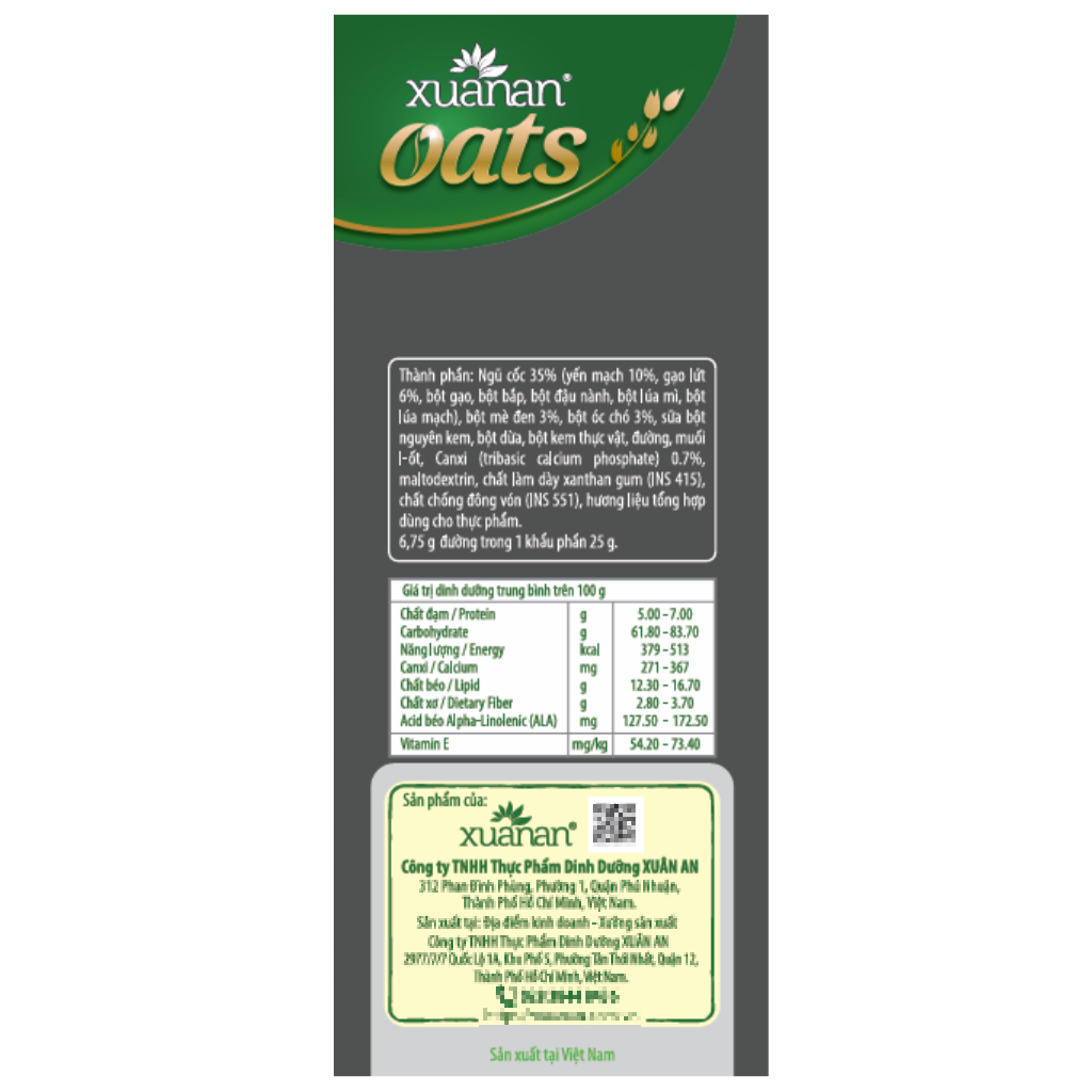 Combo Ngũ Cốc Yến Mạch Hạnh Nhân Hạt Chia 400G(25G16 GÓI)+ NC Yến Mạch Óc Chó & Mè Đen 400G(25G16 GÓI)[ít đường] Ngũ cốc YẾN MẠCH Hạnh nhân Hạt chia giàu dinh dưỡng và năng lượng, được làm từ yến mạch và nhiều loại ngũ cốc, ngoài ra còn có Hạnh nhân và Hạt chia là hai dưỡng chất chuyên biệt. Sản phẩm được bổ sung thêm can xi và sử dụng ít đường. Vitamin, chất xơ và đạm tự nhiên là nguồn dinh dưỡng tốt cho sức khỏe. Thành phần: Ngũ cốc 35% (Yến mạch 10%, bột gạo lứt 6%, bột gạo, bột bắp, bột đậu nành, bột lúa mì, bột lúa mạch), Hạt chia 3%, bột Hạnh nhân 3%, sữa bột nguyên kem, bột dừa, bột kem thực vật, đường, muối i-ốt, Canxi 0.7%, maltodextrin, chất là dày xanhthan gum (E415), chất chống đông vón (E551), hương liệu tổng hợp dùng cho thực phẩm. 6.75 gr đường trong khẩu phần 25g. Yến Mạch, Óc chó và Mè đen là ba loại hạt được dùng khá phổ biến đối với mỗi gia đình vì chúng có tác dụng rất tốt cho sức khỏe. Đặc biệt, chúng phù hợp sử dụng với nhiều lứa tuổi, ngay cả trẻ nhỏ. Khi kết hợp 3 nguyên liệu này trong chế biến ngũ cốc thì chúng là loại ngũ cốc “Ngũ cốc Yến mạch, Óc chó và Mè đen” siêu hương vị thơm ngon, dinh dưỡng, ngậy béo nhưng không ngấy. Đối tượng sử dụng: Trẻ từ 3 tuổi trở lên và người lớn, người ăn theo chế độ giảm đường. Hướng dẫn sử dụng: Hòa 1 gói Ngũ cốc với khoảng 125ml nước sôi, khuấy đều trước khi dùng. Dùng 2-3 gói mỗi ngày Bảo quản: Bảo quản nơi khô ráo, thoáng mát; tránh tiếp xúc trực tiếp với không khí và ánh nắng mặt trời. Thông tin cảnh báo: Không dùng khi sản phẩm bị rách, mốc hoặc đã hết hạn sử dụng. Sản phẩm của: Công ty TNHH Thực Phẩm Dinh Dưỡng Xuân An
