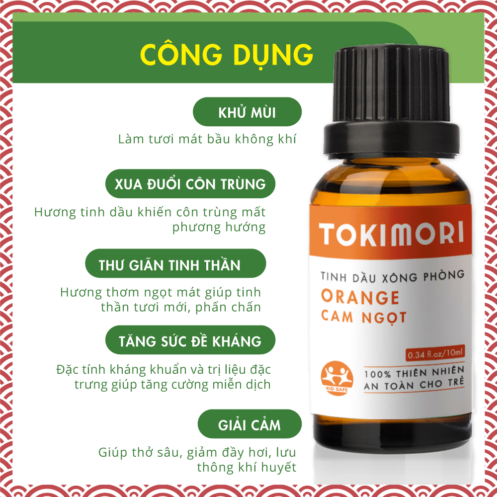 Combo 3 Chai (10ml) Tinh Dầu Sả Chanh - Cam Ngọt - Bạc Hà TOKI MORI Xuất Khẩu Nhật Bản Nguyên Chất Thiên Nhiên, An Toàn Cho Trẻ, Xông Phòng, Khử Mùi, Kháng Khuẩn, Đuổi Muỗi, Giải Cảm   Thanh lọc tâm trí, cơ thể và ngôi nhà của bạn chưa bao giờ dễ dàng hơn với tinh dầu. Với TOKIMORI, bạn có thể tạo ra một môi trường trong lành, sạch sẽ với hương thơm đến từ thiên nhiên.   5 LÝ DO ĐỂ BẠN CHỌN TINH DẦU TOKIMORI: 1- Sản phẩm đạt chứng nhận chất lượng, xuất khẩu Nhật Bản. 2- Tinh dầu thiên nhiên 100% nguyên chất. An toàn cho trẻ. 3- Hàm lượng đảm bảo tiêu chuẩn nguyên liệu dược, giá trị sử dụng cao. 4- Hương thơm quyến rũ, nhẹ nhàng, tinh tế, lưu hương lâu. 5- Tuyệt đối an toàn cho sức khỏe.   TINH DẦU SẢ CHANH TOKIMORI 10ML Sả chanh - Lemongrass với hương thơm tươi mát đặc trưng có nguồn gốc từ Việt Nam, được trồng nhiều ở miền Đông Nam Bộ, Tây Nguyên và một số nông trường miền Bắc. Tên khoa học: Cymbopogon citratus Thành phần: Chiết xuất nguyên chất từ thân và lá Sả chanh.   TINH DẦU CAM NGỌT TOKIMORI 10ML Cam Ngọt - Sweet Orange mang hương thơm cam chanh ngọt ngào, tươi mát đến từ những nông trại của nước Úc xinh đẹp. Tên khoa học: Citrus sinensis Thành phần: chiết xuất 100% tự nhiên  từ phần vỏ của trái cam.   TINH DẦU BẠC HÀ TOKIMORI 10ML Bạc Hà - Peppermint mang hương thơm the mát sảng khoái từ những cánh đồng rộng lớn của đất nước Ấn Độ, một trong những quốc gia sản xuất tinh dầu hàng đầu thế giới. Tên khoa học: Mentha arvensis Thành phần: chiết xuất 100% tự nhiên  từ thân và lá Bạc hà.   CÔNG DỤNG: ► Khử mùi, diệt khuẩn, thanh lọc không khí ► Đuổi muỗi và côn trùng ► Thư giãn, giảm căng thẳng ► Giải cảm, hỗ trợ chữa trị nghẹt mũi ► Nâng cao chất lượng giấc ngủ   CÁCH SỬ DỤNG: ► Khử mùi diệt khuẩn, làm thơm không gian: cho 3-5 giọt tinh dầu vào đèn xông giúp lan tỏa khắp gian phòng, làm sạch không khí. Có thể trộn các mùi với tỷ lệ 1:1:1 hoặc tỷ lệ khác tùy sở thích để có những trải nghiệm đặc biệt hơn. ► Đuổi muỗi, côn trùng: Xịt trực tiếp vào khu vực côn trùng ở hoặc bôi lên da (đã pha loãng), quần áo khi hoạt động ngoài trời.  ► Giải cảm, thư giãn: pha một ít nước lạnh vào bát nước đã đun sôi, cho 3-5 giọt tinh dầu vào,, trùm kín khăn và xông hơi trong vòng từ 10-15 phút. Với mùi thơm tươi mát, dễ chịu, tinh dầu kích thích hệ thống cảm xúc của não bộ giúp thư giãn, giảm căng thẳng, xoa dịu thần kinh, giúp bạn có giấc ngủ sâu và ngon giấc.   LƯU Ý TRƯỚC KHI SỬ DỤNG