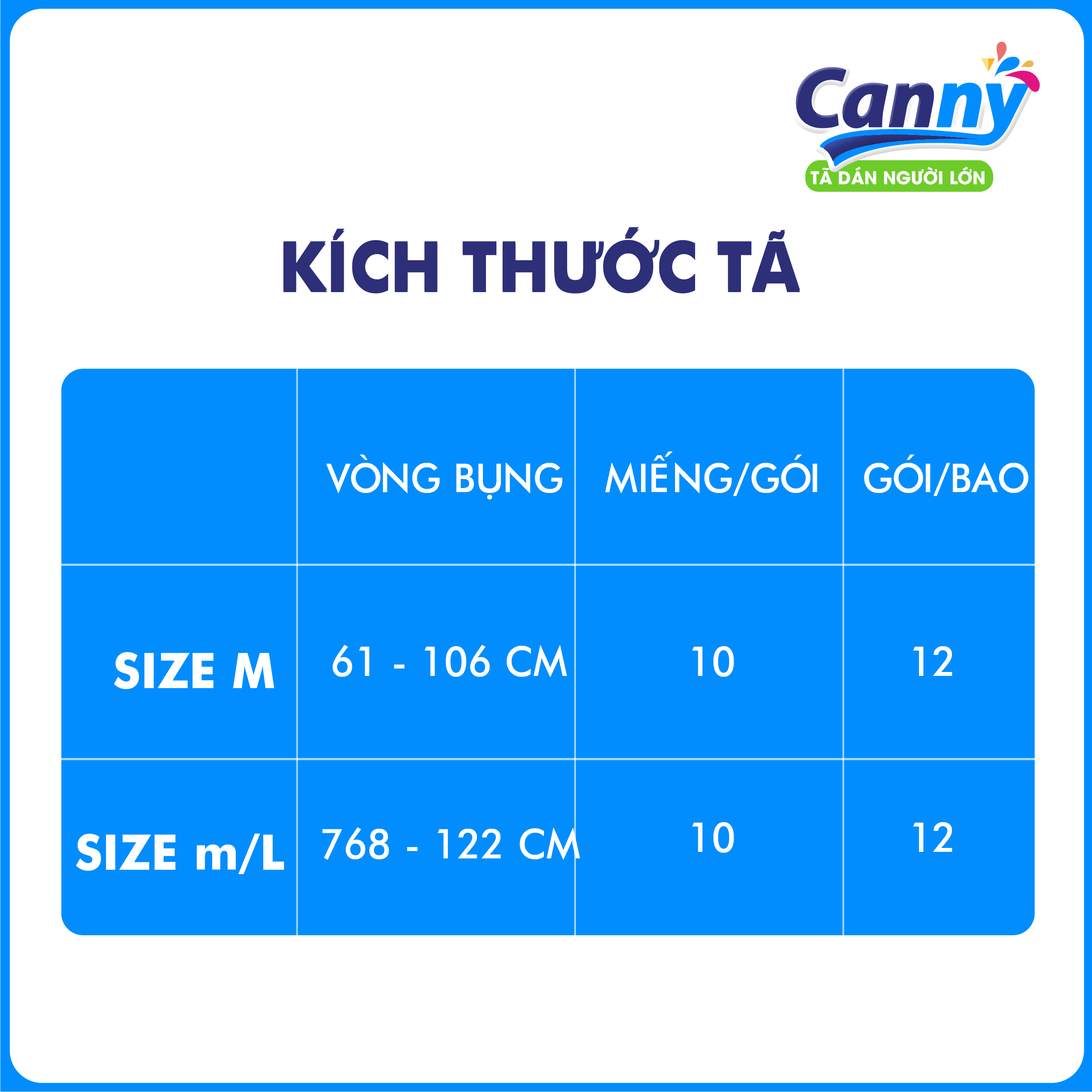Tã Dán Người Lớn Canny Siêu Mềm, Siêu Thấm, Kháng Khuẩn Size M10, M/L10 (10 miếng) I. THÔNG TIN SẢN PHẨM Thương hiệu: Xuất xứ: Việt Nam Sản xuất tại: Công ty TNHH Javi -