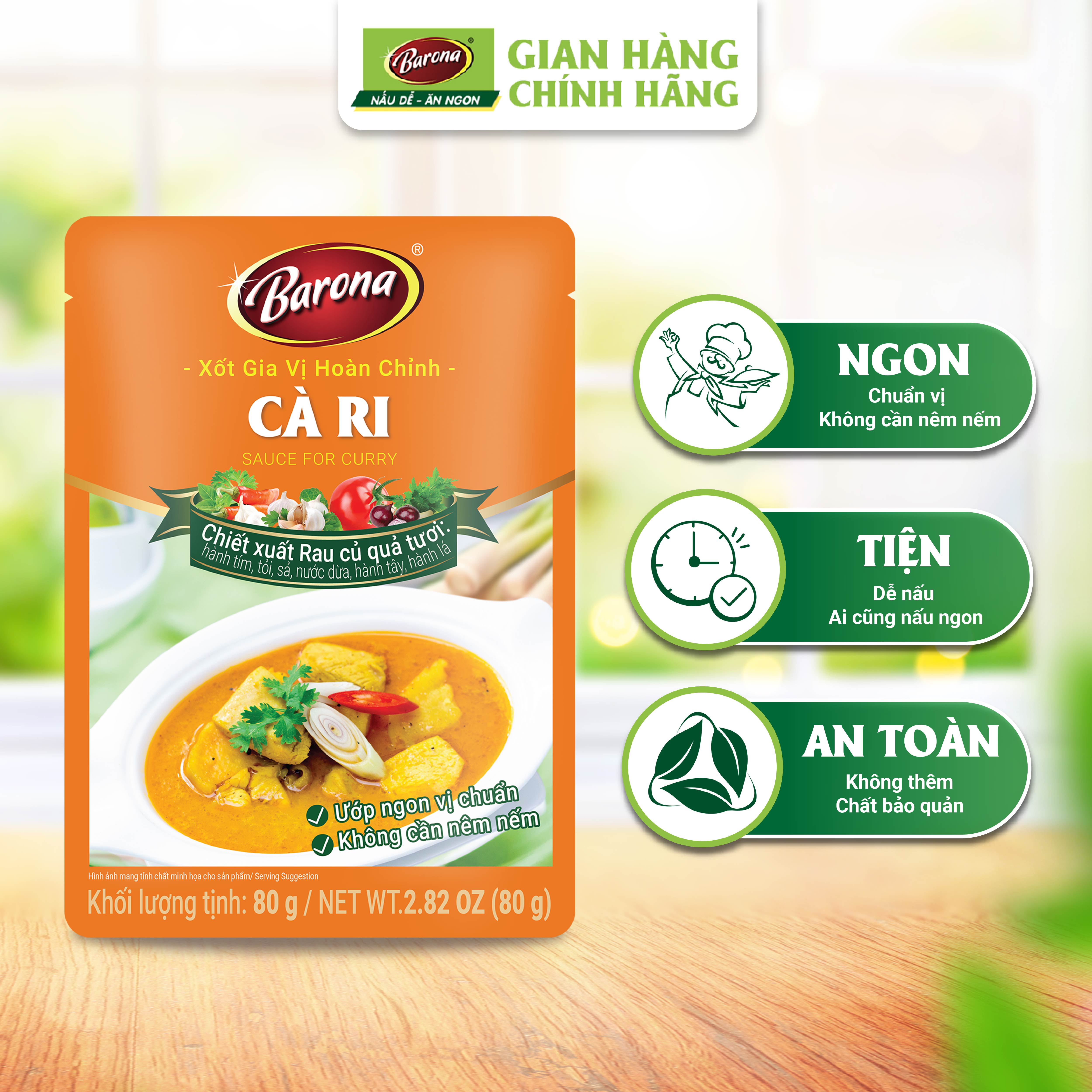XỐT GIA VỊ HOÀN CHỈNH BARONA CÀ RI 80G Xốt Gia Vị Hoàn Chỉnh Barona là công thức phối trộn độc đáo giữa CHIẾT XUẤT RAU CỦ QUẢ TƯƠI như hành, tỏi, me, cà chua…cùng các loại gia vị truyền thống được chọn lọc, đem đến món ngon chuẩn vị chỉ trong tích tắc mà KHÔNG CẦN NÊM NẾM thêm bất kỳ gia vị nào khác. *ĐIỂM MẠNH: