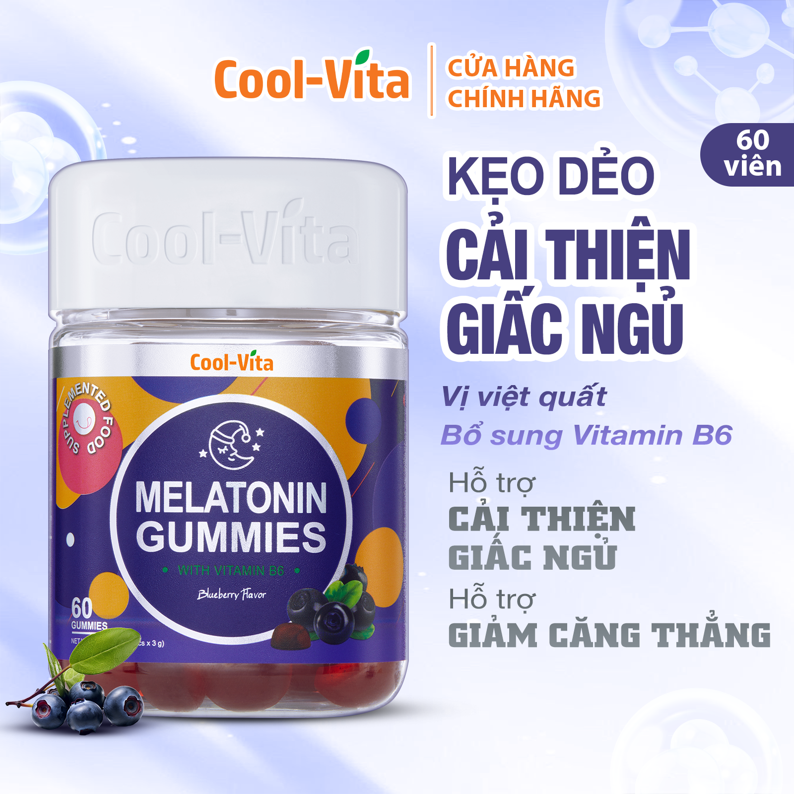 Combo 3 Hộp Kẹo Dẻo Melatonin Giúp Cải Thiện Giấc Ngủ & Giảm Căng Thẳng Vị Việt Quất Kết Hợp Vitamin B6 CoolVita – (60 viên x 3g)/hộp Bạn đang gặp khó khăn khi đi vào giấc ngủ? Vậy thì đừng nên bỏ qua Kẹo Dẻo Melatonin Vị Việt Quất của CoolVita! Kẹo Dẻo Melatonin CoolVita Vị Việt Quất Kết Hợp Vitamin B6 hỗ trợ điều chỉnh chu kỳ giấc ngủ và hỗ trợ cải thiện chất lượng giấc ngủ ngon hơn. Với 6mg melatonin trong mỗi 2 viên kẹo, kết hợp cùng vitamin B6 hỗ trợ giảm căng thẳng, có một đêm ngủ ngon và sâu hơn. Công dụng nổi bật: Hỗ trợ cải thiện chất lượng giấc ngủ: Mỗi 2 viên kẹo dẻo chứa 6mg Melatonin kết hợp Vitamin B6 hỗ trợ điều chỉnh chu kỳ giấc ngủ tự nhiên, giúp bạn dễ dàng đi vào giấc ngủ và duy trì giấc ngủ sâu suốt đêm. Hỗ trợ giúp thư giãn trước khi ngủ: Vitamin B6 giúp tạo cảm giác thư giãn trước khi ngủ, giúp cơ thể dễ dàng đi vào giấc ngủ. An toàn và lành mạnh: Kẹo Dẻo Melatonin CoolVita không phải là thuốc ngủ, hỗ trợ bạn ngủ ngon hơn. Nguyên liệu từ thực vật: Được làm bằng pectin từ thực vật thay vì gelatin, sản phẩm an toàn cho sức khỏe và phù hợp với chế độ ăn chay.   Đặc điểm sản phẩm: Hương vị thơm ngon: Vị việt quất chua ngọt dễ chịu, kẹo dẻo mềm mịn, ngon miệng, không gây dính răng. Dễ sử dụng: Sản phẩm được chế biến thành dạng kẹo dẻo nhai tiện lợi. Tiện lợi mang theo: Hộp nhựa nhỏ gọn, dễ dàng mang theo khi đi công tác hoặc du lịch.   Khối lượng tịnh: 180g (60 viên x 3g)   Lưu ý: Đối với người đang sử dụng thuốc, nên tham vấn ý kiến của Bác Sĩ về thành phần của sản phẩm trước khi dùng. Không sử dụng trước hoặc trong khi lái xe. Không sử dụng cho người dưới 18 tuổi, phụ nữ có thai hoặc đang cho con bú. Không sử dụng sản phẩm có dấu hiệu lạ hoặc sản phẩm đã hết hạn sử dụng. Không sử dụng cho người có mẫn cảm với bất kỳ thành phần nào của sản phẩm.   *Sản phẩm này không phải là thuốc và không có tác dụng thay thế thuốc chữa bệnh (Hiệu quả của sản phẩm tùy thuộc vào cơ địa của từng người mà tác dụng sẽ khác nhau) Thực phẩm bổ sung không thể thay thế cho chế độ ăn uống đa dạng và cân bằng hoặc lối sống lành mạnh. Nếu có bất kỳ phản ứng phụ nào xảy ra, hãy ngừng sử dụng sản phẩm này ngay lập tức.   Xuất xứ: Trung Quốc   Thời hạn sử dụng: 18 tháng kể từ NSX