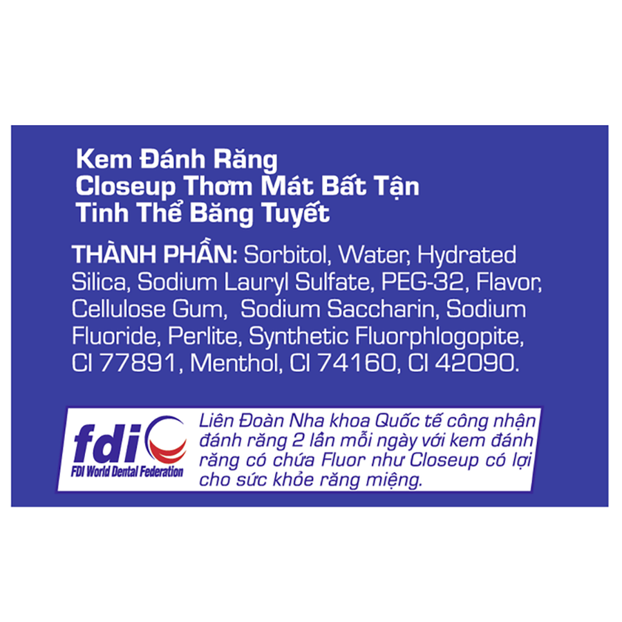 - Kem đánh răng dạng gel giúp sạch khuẩn Closeup Thơm Mát Bất Tận Tinh Thể Băng Tuyết với công thức Thơm Mát 3 Cực hoàn toàn mới