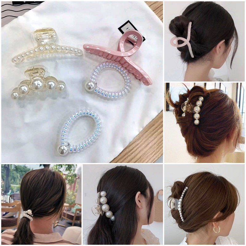 Bộ 5 món kẹp tóc đính ngọc trai, cột tóc Hàn Quốc phong cách trẻ trung xinh xắn KT28 Kẹp càng cua, dây buộc tóc đính ngọc trai là món phụ kiện tóc rất được