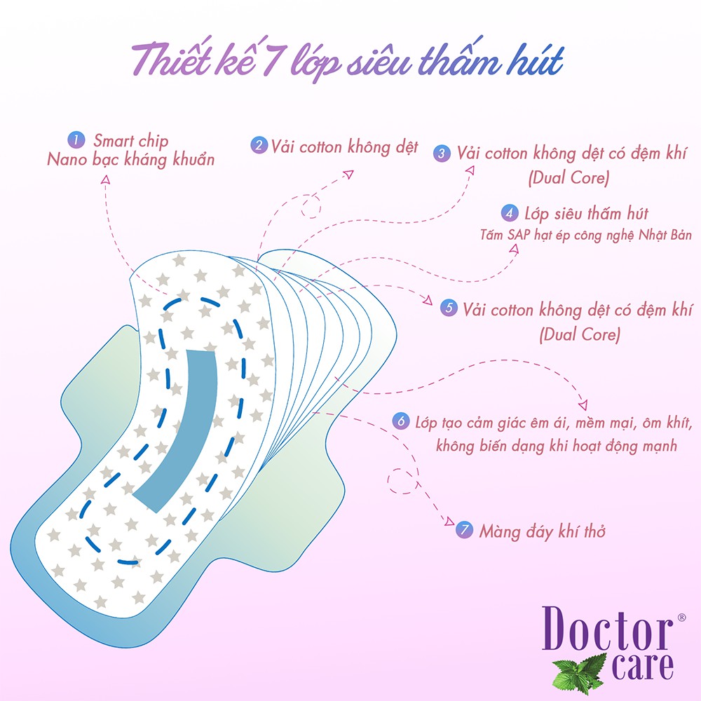 - Băng vệ sinh thảo dược Doctor Care ban ngày có cấu trúc 3D gồm 7 lớp thấm hút và kháng khuẩn nhưng vẫn giữ được kết cấu siêu mỏng, siêu nhẹ