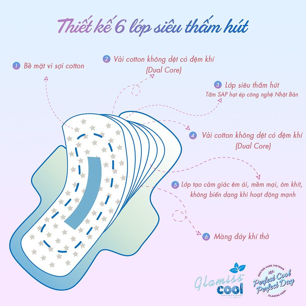 • Băng vệ sinh thảo dược Glamiss Cool ban ngày có cấu trúc 3D gồm 6 lớp thấm hút và kháng khuẩn nhưng vẫn giữ được kết cấu siêu mỏng, siêu nhẹ