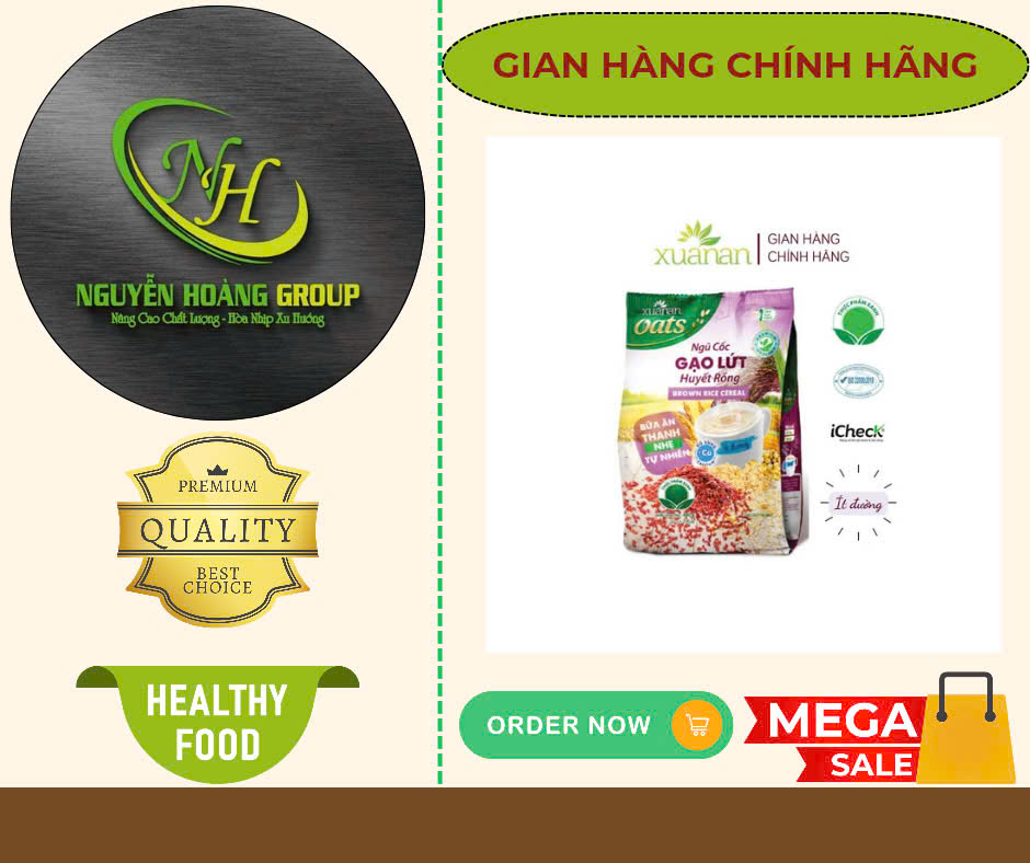 Thành Phần: Gạo lứt huyết rồng , Yến Mạch , Ngô , Đậu Xanh , lúa mạch , múa mỳ , canxi Công dụng : Trong ngũ Cốc có đường ISOMALT : Đây là loại dường chiết xuất từ củ cải đường , được viện dinh dưỡng và trung tâm nghiên cứu bệnh đái tháo đường khuyên dùng => Rát tốt cho sức khỏe , phòng bệnh mãn tính đặc biệt là bệnh tiểu đường. Đối Tượng Sử dụng: