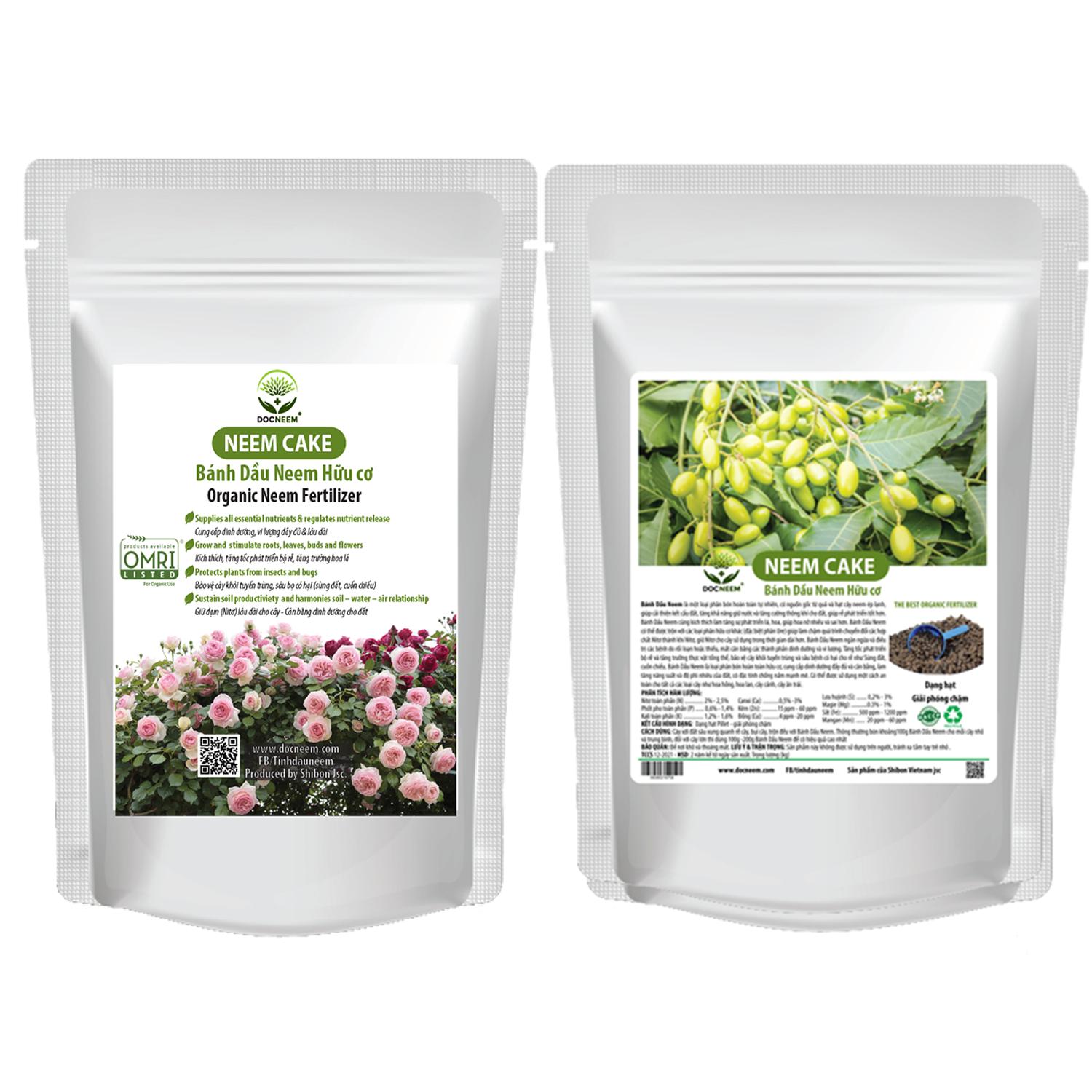 Thông tin sản phẩm Bánh dầu neem Neemcake DOCNEEM: Phân bón hữu cơ hoàn toàn tự nhiên ép theo công nghệ hiện đại ""COLD PRESSED" Neemcake là phân bón 100% tự nhiên, nguồn gốc từ quả và hạt cây neem ép lạnh. Túi 1kg (Túi bạc cao cấp). Thương hiệu DOCNEEM đã được đăng ký bảo hộ tại cục sở hữu trí tuệ Việt Nam. Có hàm lượng Aradirachtin tự nhiên cao nhất thị trường 2000ppm. Kết cấu hình dạng: Dạng hạt Pillet - giải phóng chậm. Phân bón hữu cơ trị sùng đất cuốn chiếu, kích rễ đẩy chồi Công dụng Bánh dầu neem Neemcake DOCNEEM: Cải thiện kết cấu đất, tăng khả năng giữ nước và tăng cường thông khí cho đất,  rễ phát triển tốt hơn. Kích thích làm tăng sự phát triển lá, hoa hồng, giúp hoa nở nhiều và sai hơn. Neemcake có thể được trộn với các loại phân hữu cơ khác (đặc biệt phân Ure) giúp làm chậm quá trình chuyển các hợp chất đạm (Nitơ) thành khí Nitơ, giữ đạm (Nitơ) cho cây sử dụng trong thời gian dài hơn. Bánh Dầu Neem ngăn ngừa và điều trị các bệnh vàng lá, thiếu vi lượng do rối loạn hoặc thiếu, mất cân bằng các thành phần dinh dưỡng. Bảo vệ cây khỏi tuyến trùng và trị sâu bệnh gây hại cho rễ như Sùng đất, cuốn chiếu. Cung cấp dinh dưỡng đầy đủ và cân bằng, làm tăng năng suất và độ phì nhiêu của đất, có đặc tính chống nấm mạnh mẽ. Có thể được sử dụng một cách an toàn cho tất cả các loại cây như hoa hồng, hoa lan, cây cảnh, cây ăn trái. Công nghệ hạt giải phóng chậm, giúp thông khí, kích rễ, hấp thụ dinh dưỡng tốt hơn Hàm lượng vi lượng có trong Bánh dầu neem Neemcake DOCNEEM: Nitơ toàn phần (N) ... 2% - 2,5% Phốt pho toàn phần (P) . 0,6% - 1,4% Kali toàn phần (K) .... 1,2% - 1,6% Canxi (Ca): .0,5% -3% Kẽm (Zn): .15 ppm - 60 ppm Đồng (Cu): .4 ppm -20 ppm Lưu huỳnh (S): .. 0,2% - 3% Magie (Mg): .0.3% - 1% Sắt (Fe): . 500 ppm - 1200 ppm Mangan (Mn): . 20 ppm - 60 ppm Hướng dẫn sử dụng Bánh dầu Neem Neemcake Docneem: Cây đã sang chậu: Cày xới đất sâu xung quanh rễ, trộn đều đất với Neem cake (lưu ý cách xa rễ) Cây sang chậu mới: Trộn đều với đất và giá thể Thông thường bón khoảng 100g - Bánh Dầu Neem cho mỗi cây nhỏ và trung bình, đối với cây lớn thì dùng 100g - 200g Bánh Dầu Neem để có hiệu quả cao nhất Sau 1 tháng phải bón lại. Sản phẩm hữu cơ, an toàn đối với người sử dụng, có thể bón không cần dùng găng tay