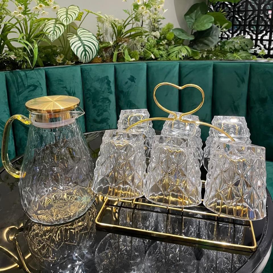 Bộ bình 6 cốc thủy tinh chịu nhiệt mạ vàng cao cấp