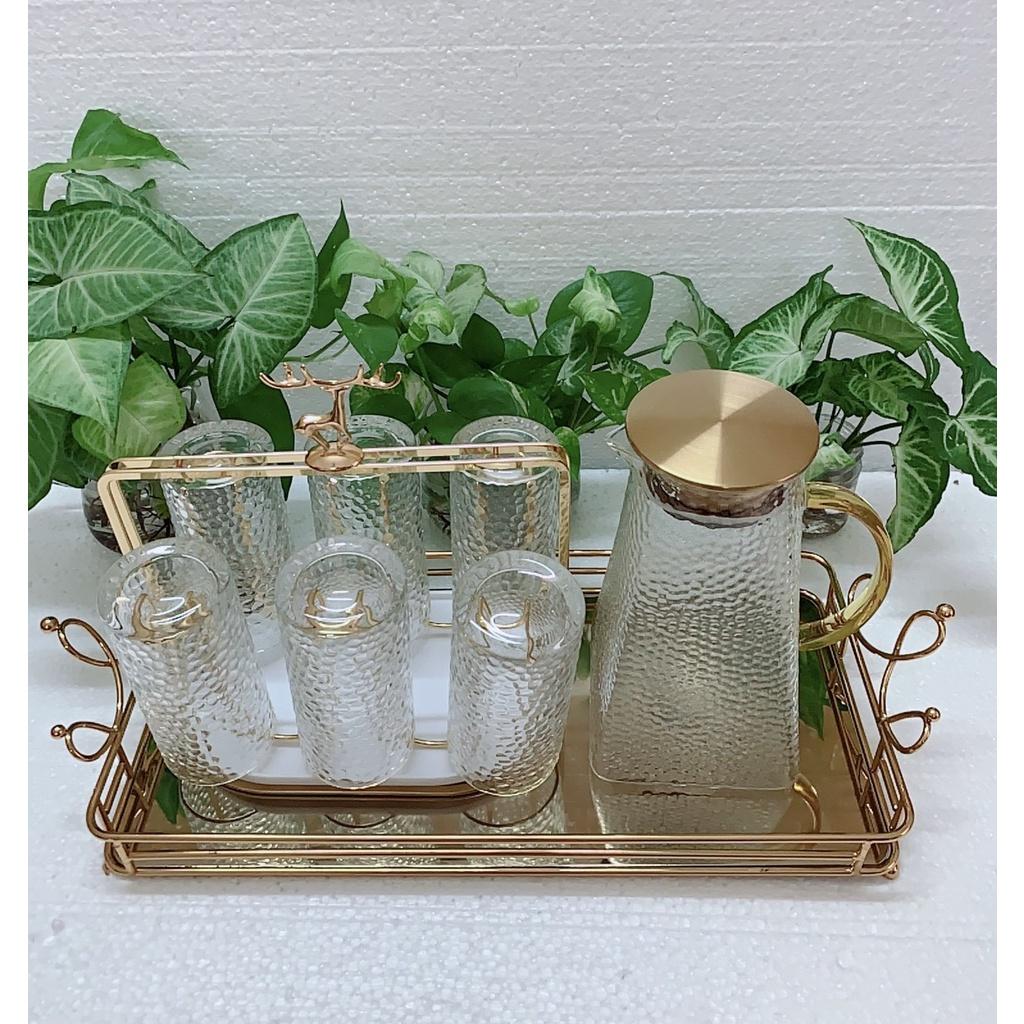 ✨COMBO BỘ BÌNH CỐC THỦY TINH CHỊU NHIỆT CAO CẤP KÈM KHAY VƯƠNG MIỆN VÀNG VÀ GIÁ ÚP CỐC