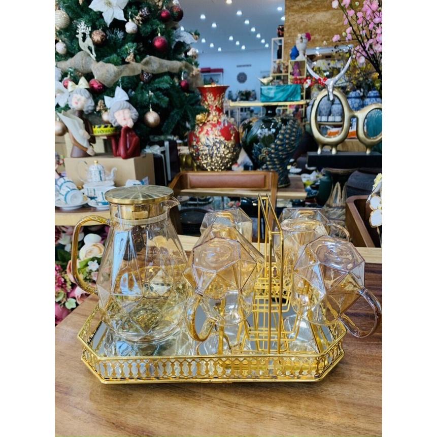 ✨Combo bộ bình đựng nước thủy tinh cao cấp 6 cốc kèm khay và giá úp mạ vàng
