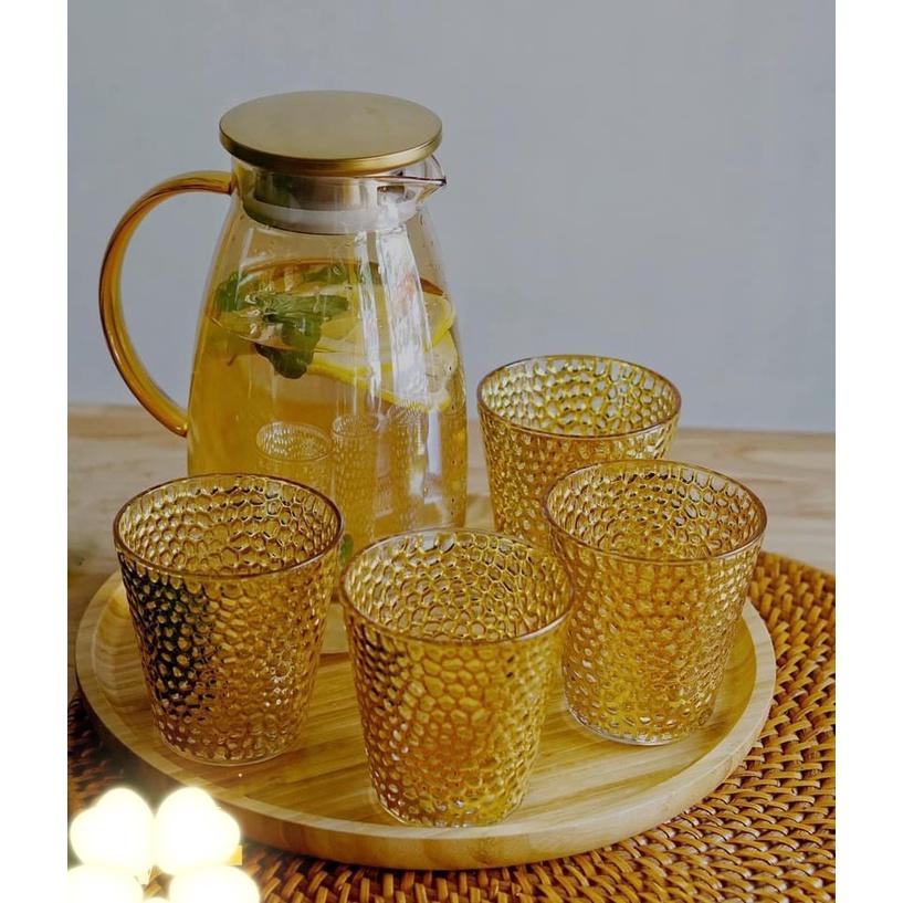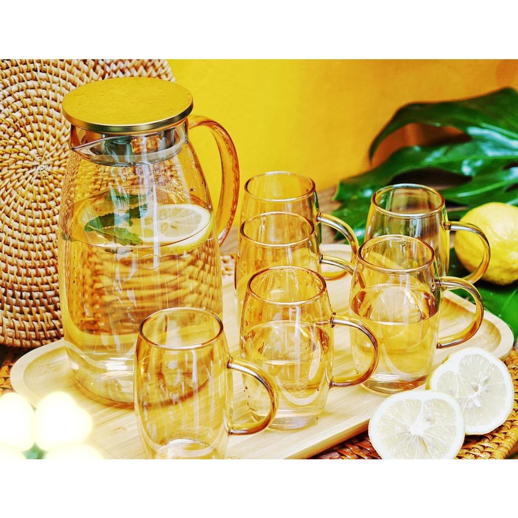 ✨Combo bộ bình đựng nước uống thủy tinh chịu nhiệt cao cấp kèm khay gỗ màu vàng
