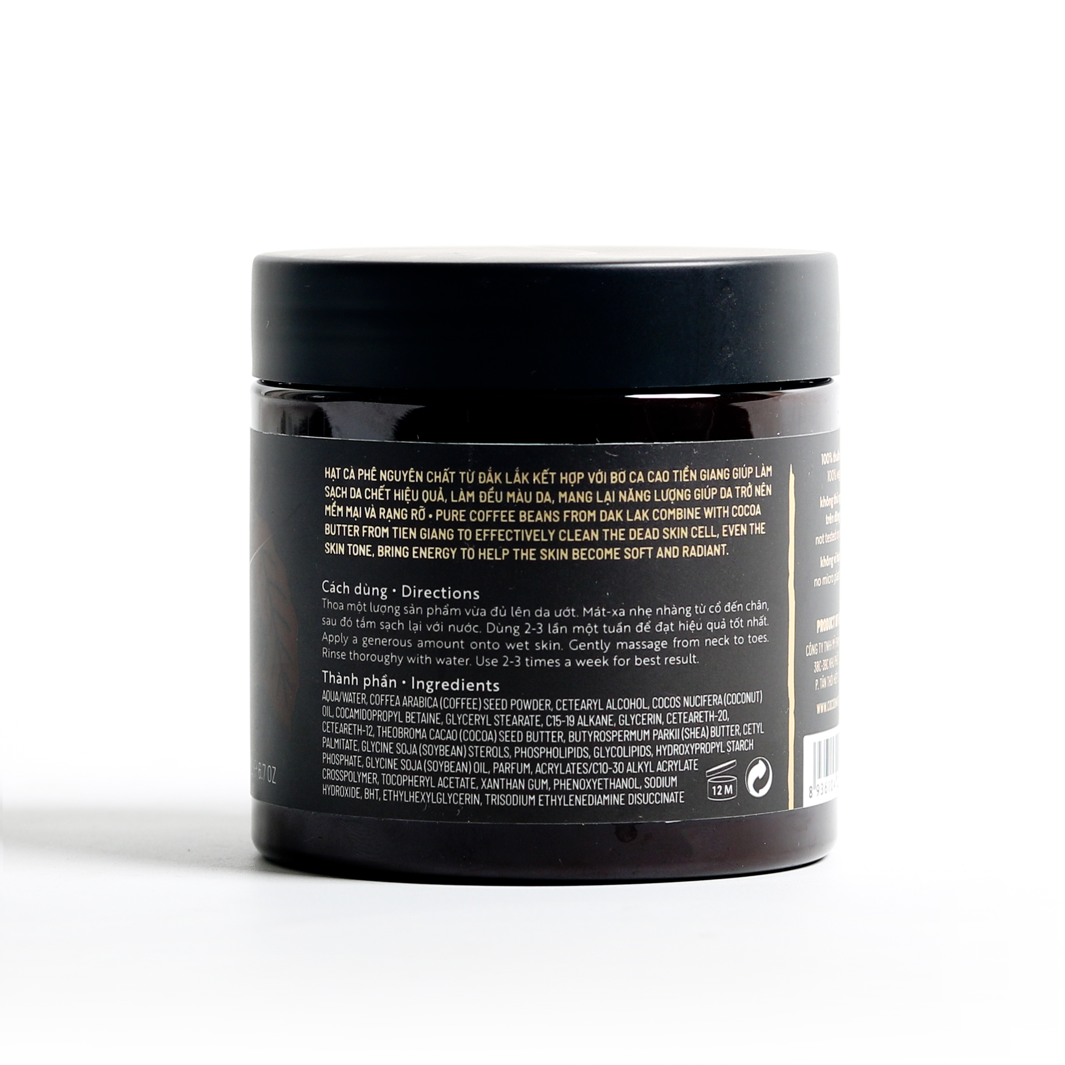 - Không vi hạt nhựa (no micro plastic beads) Cách dùng Cà phê Đăklăk làm sạch da chết. Thoa một lượng sản phẩm lên da ướt. Mát-xa nhẹ nhàng từ cổ đến chân, sau đó tắm sạch lại với nước. Dùng 2-3 lần một tuần để đạt kết quả tốt nhất. Thành phần đầy đủ Cà phê Đăklăk làm sạch da chết: Aqua/Water, Coffea Arabica (coffee) Seed Powder, Cetearyl Alcohol, Cocos Nucifera (coconut) Oil, Cocamidopropyl Betaine, Glyceryl Stearate, C15-19 Alkane, Glycerin, Ceteareth-20, Ceteareth-12, Theobroma Cacao (Cocoa) Seed Butter, Butyrospermum Parkii (shea) butter, Cetyl Palmitate, Glycine Soja (soybean) Sterols, Phospholipids, Crosspolymer, Tocopheryl Acetate, Xanthan gum, Phenoxyethanol, Sodium Hydroxide, BHT, Ethylhexylglycerin, Trisodium Ethylenediamine Disuccinate. Hạn sử dụng: 3 năm kể từ ngày sản xuất, in trên chai. Mở nắp dùng trong 12 tháng.
