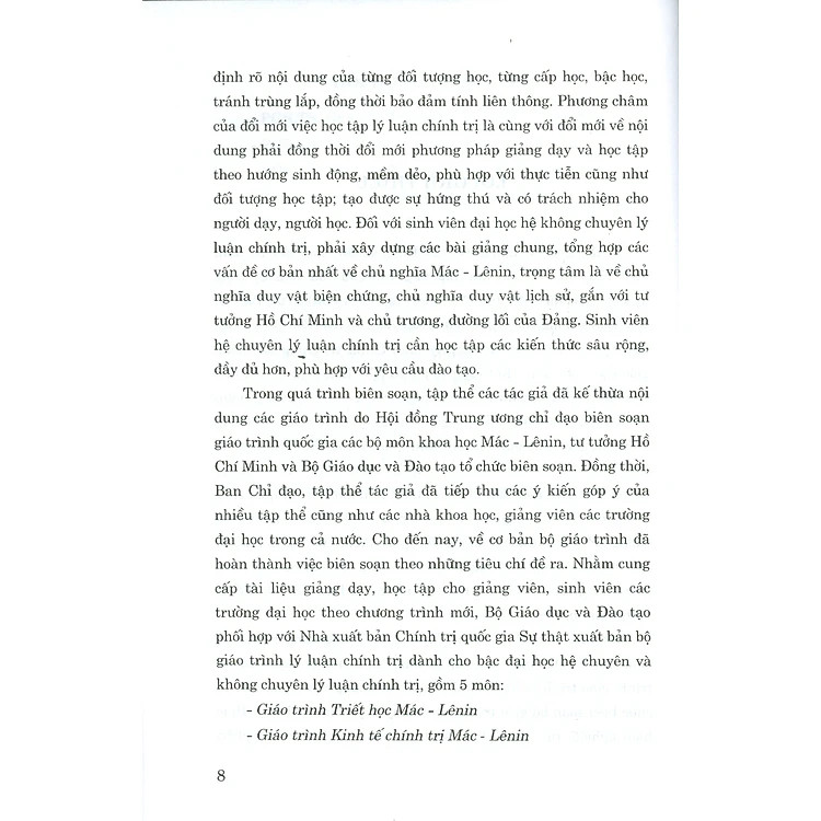Bộ sách là tài liệu giảng dạy, học tập cho giảng viên, sinh viên các trường đại học theo chương trình mới do Bộ Giáo dục và Đào tạo và Nhà xuất bản Chính trị Quốc gia xuất bản.