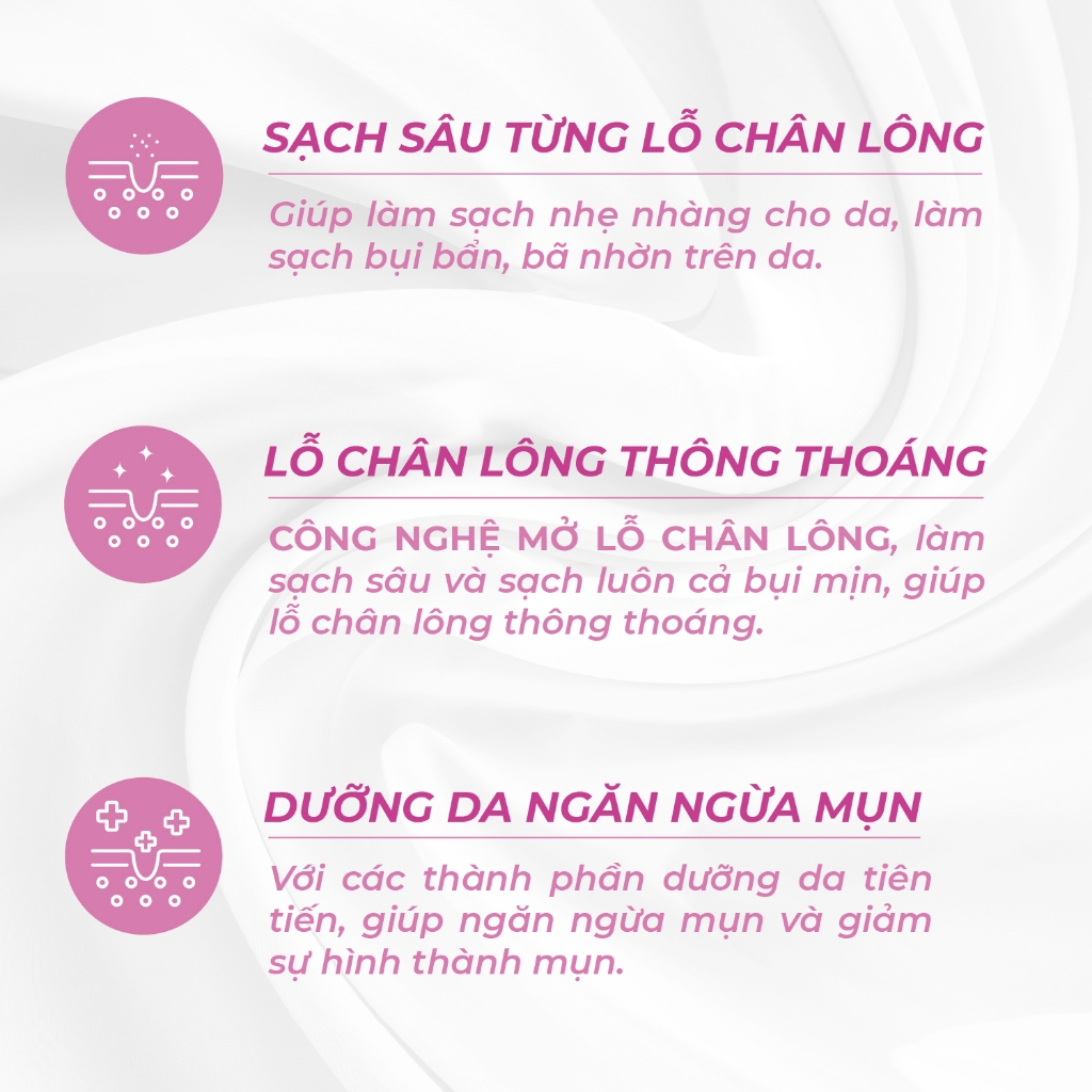- Sạch sâu từng lỗ chân lông. Giúp làm sạch nhẹ nhàng cho da, làm sạch bụi bẩn, dầu thừa, bã nhờn trên da