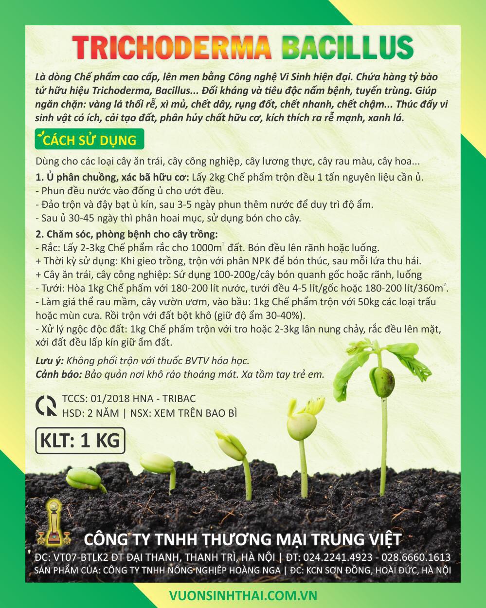 Chế phẩm vi sinh TRIBAC là dòng chế phẩm sinh học có chứa tổng hợp các vi nấm đối kháng trichoderma và vi khuẩn có lợi bacillus. Được lên men và sản xuất bằng công nghệ sinh học hiện đại, nên có hoạt năng ưu việt hoàn toàn so với các sản phẩm chỉ chứa nấm đối kháng trichoderma thông thường.