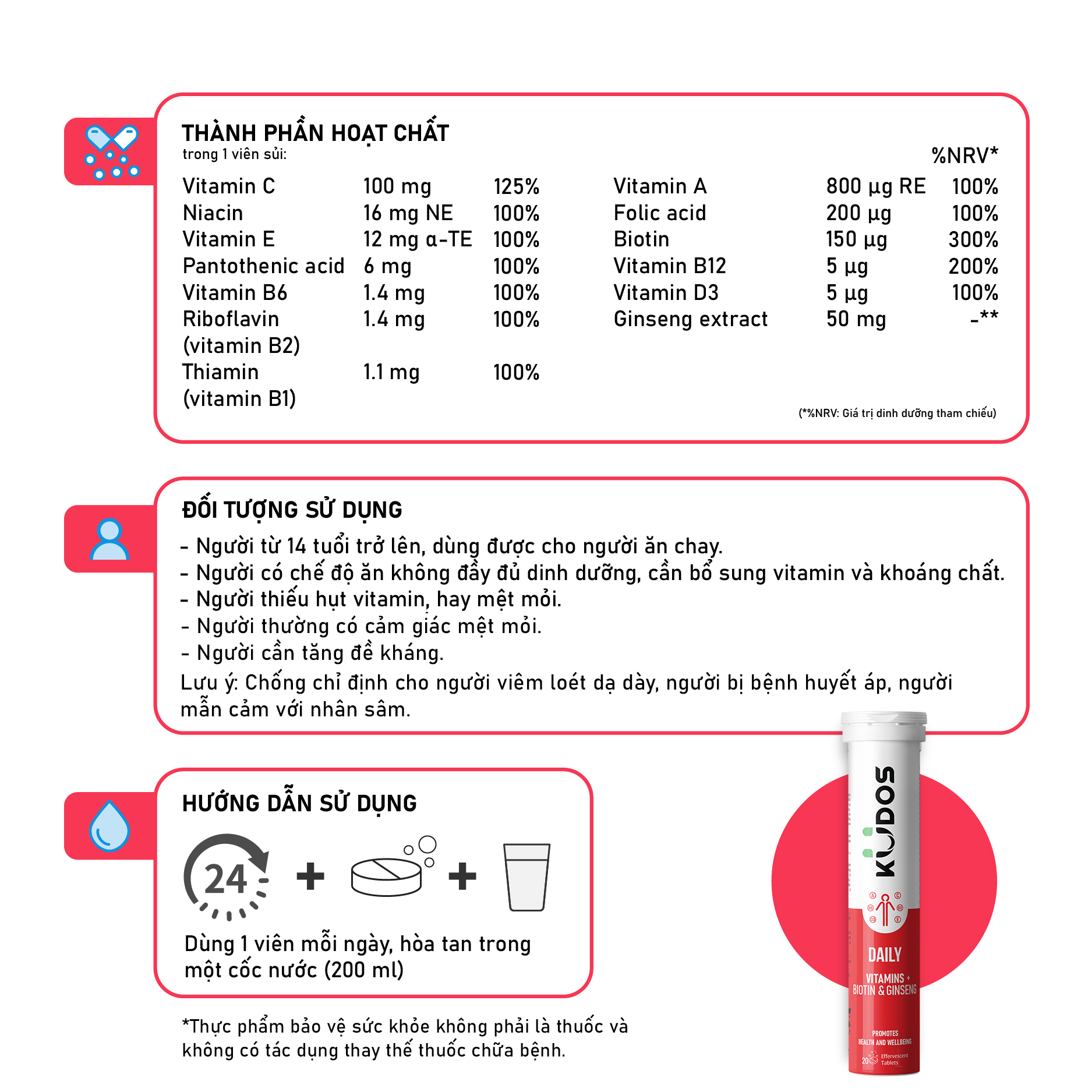 - KUDOS DAILY Bổ sung vitamin (A, C, D3, E, B1, B2, B3, B5, B6, B8, B9, B12) cho cơ thể. Thành phần hoạt chất: