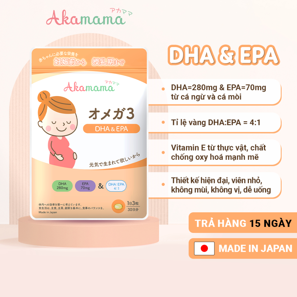 - Viên Uống Bổ Sung DHA, EPA, Omega 3 Cho Mẹ Bầu Hỗ Trợ Phát Triển Não Bộ Và Thị Giác Thai Nhi, Viên Nhỏ, Không Mùi, Dễ Uống, Akamama Nhật Bản Gói 90 Viên ƯU ĐIỂM CỦA SẢN PHẨM DHA & EPA CHO BÀ BẦU AKAMAMA, NHẬT BẢN: